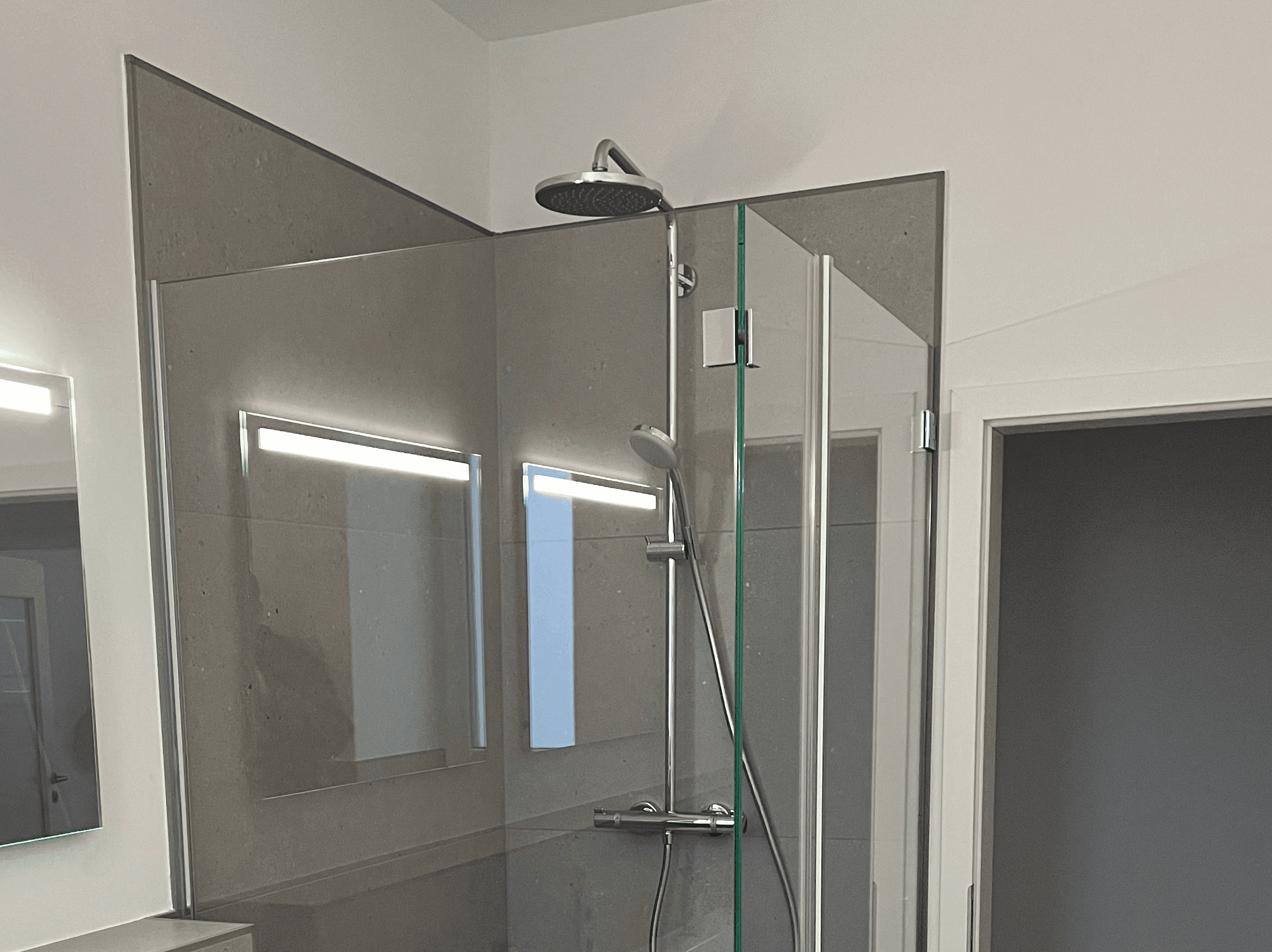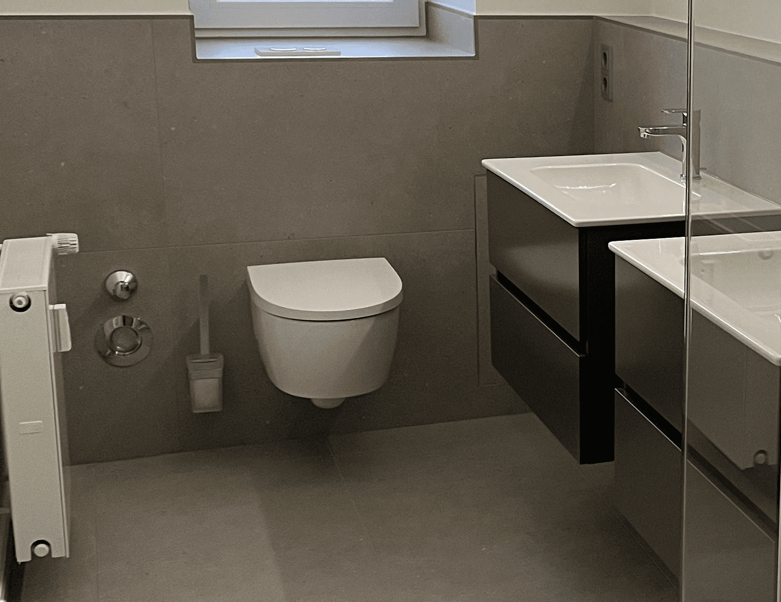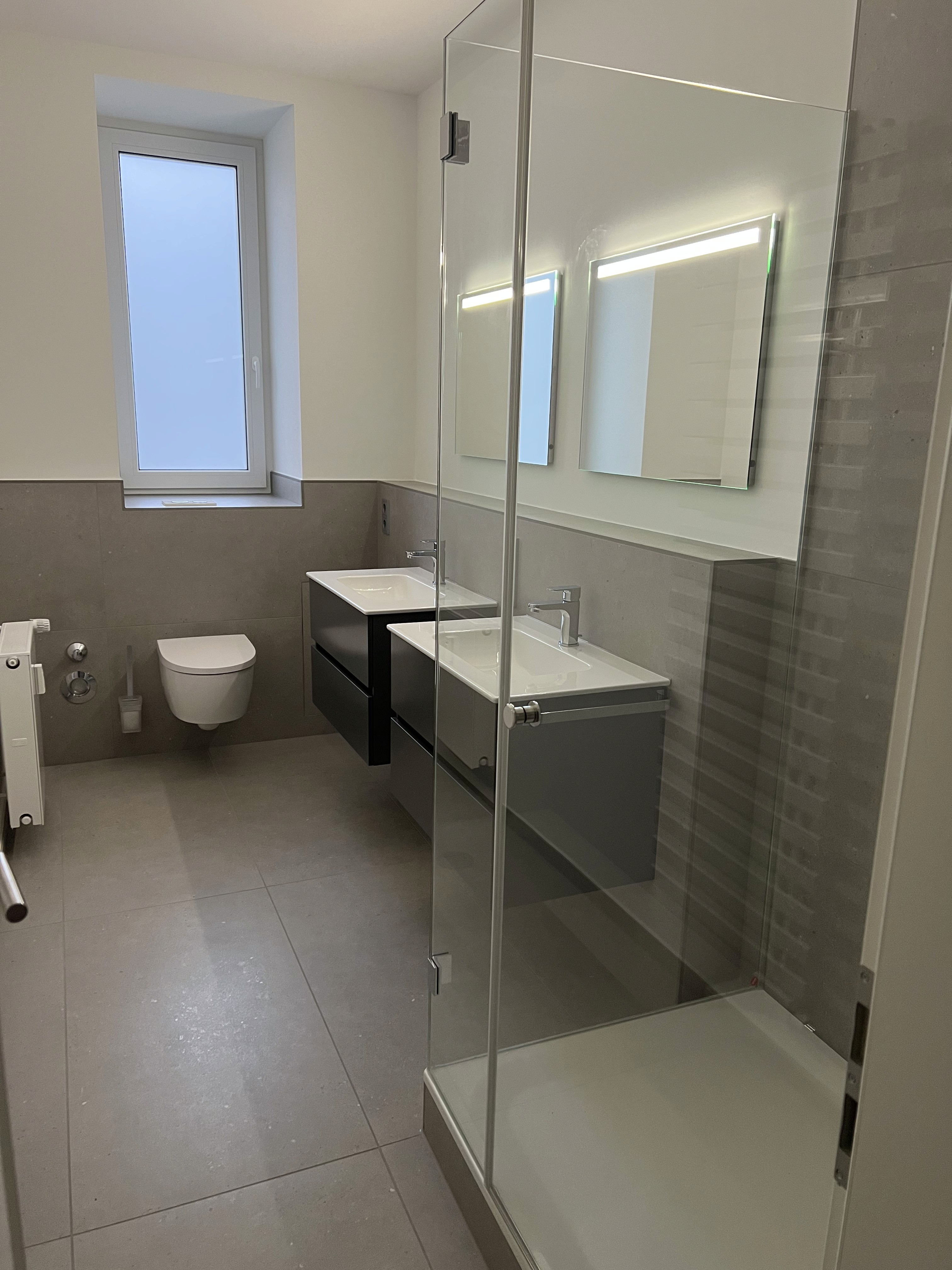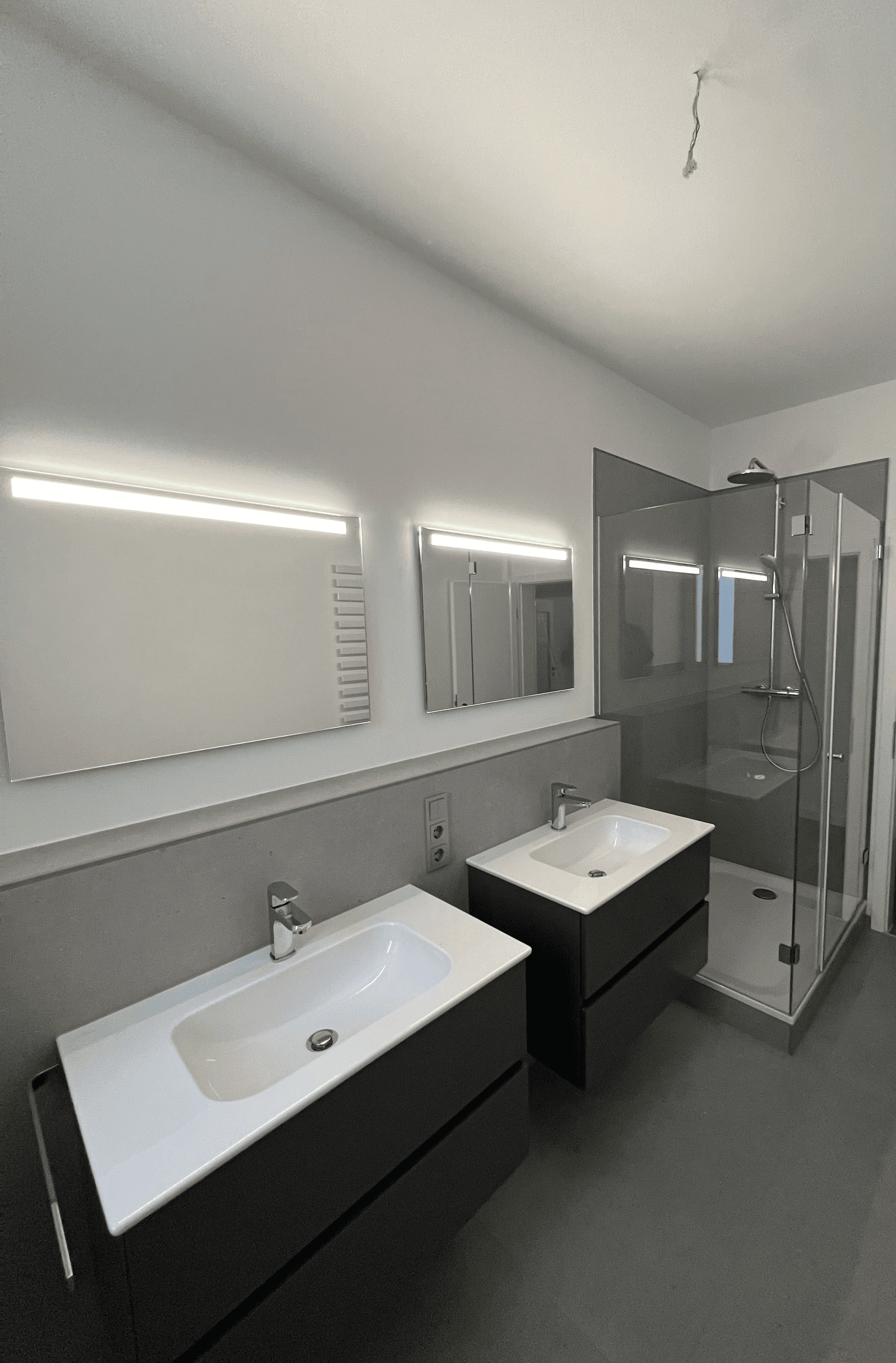 Ergänzt wird der Waschbereich durch zwei identische LED-Spiegel, die für eine gleichmäßige Ausleuchtung sorgen und die klare Symmetrie des Raumes unterstreichen. Die Fliesen sind umlaufend ausgeführt und bewusst pflegeleicht gewählt. Abschlussschienen sorgen für saubere, harmonische Übergänge und ein klares Gesamtbild.
