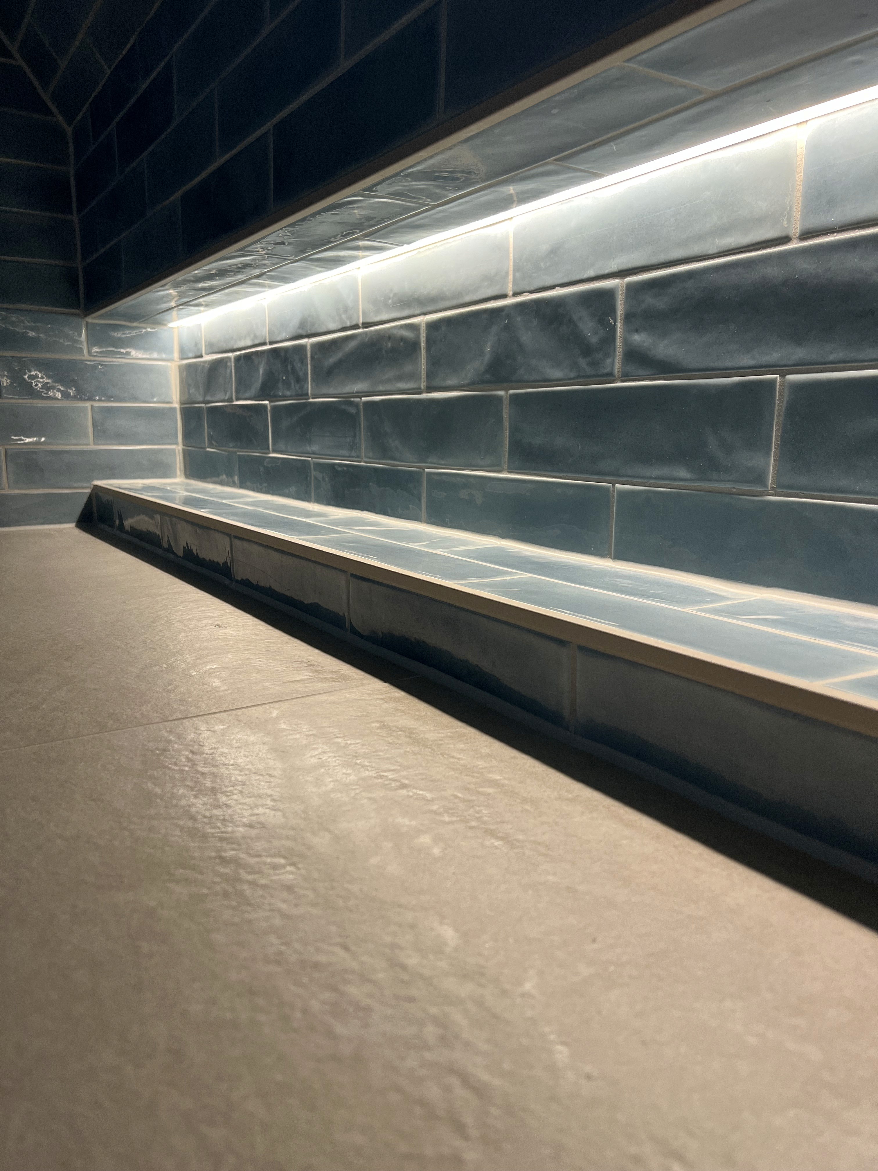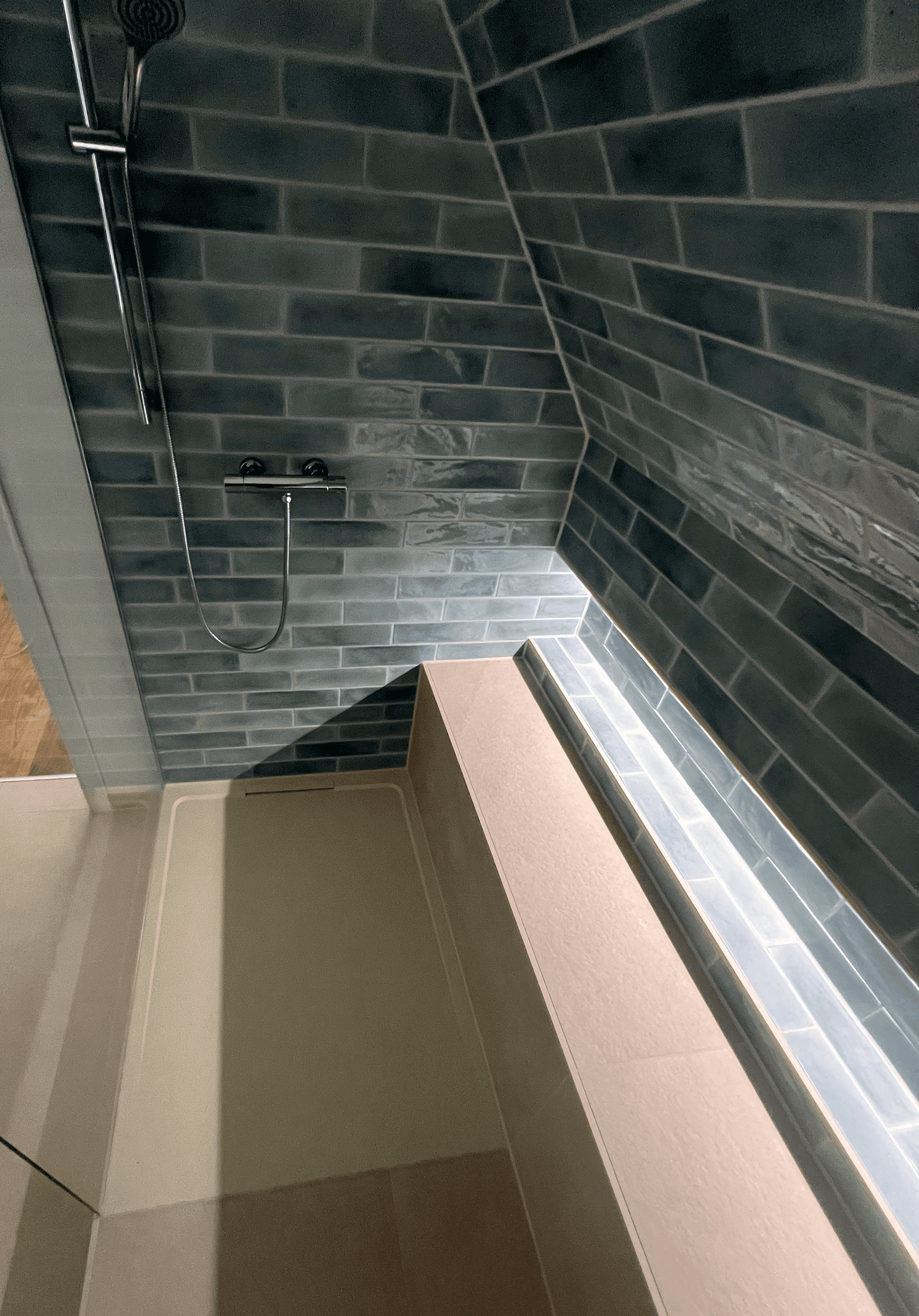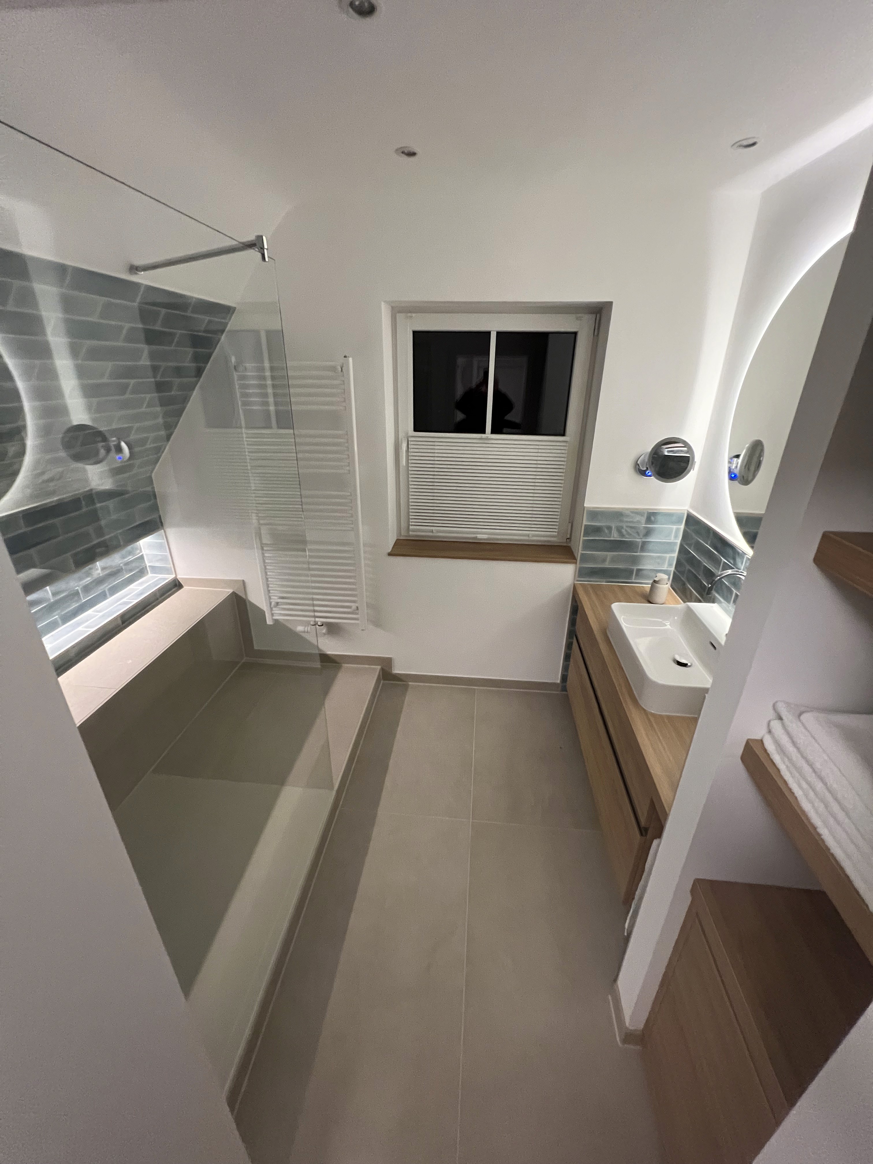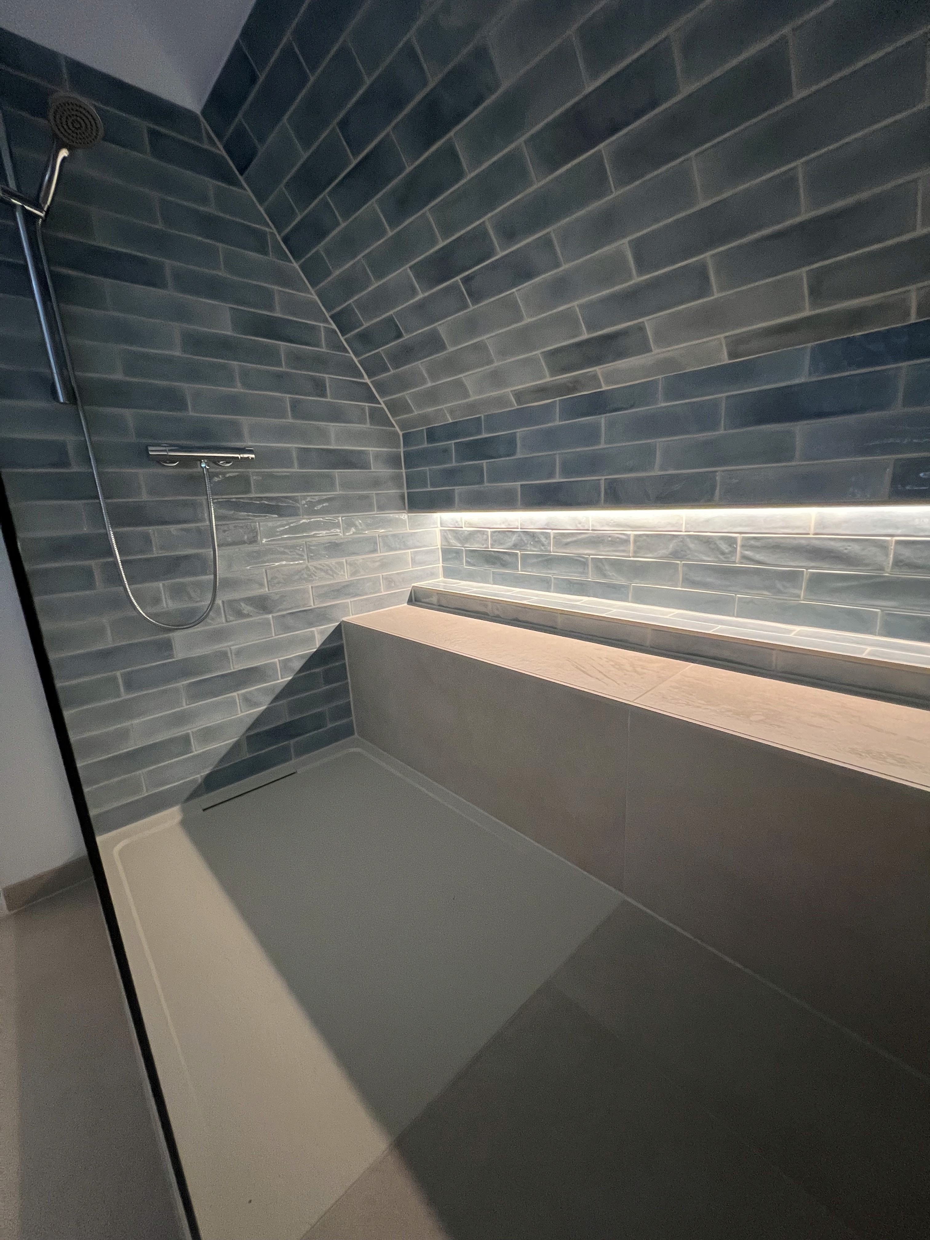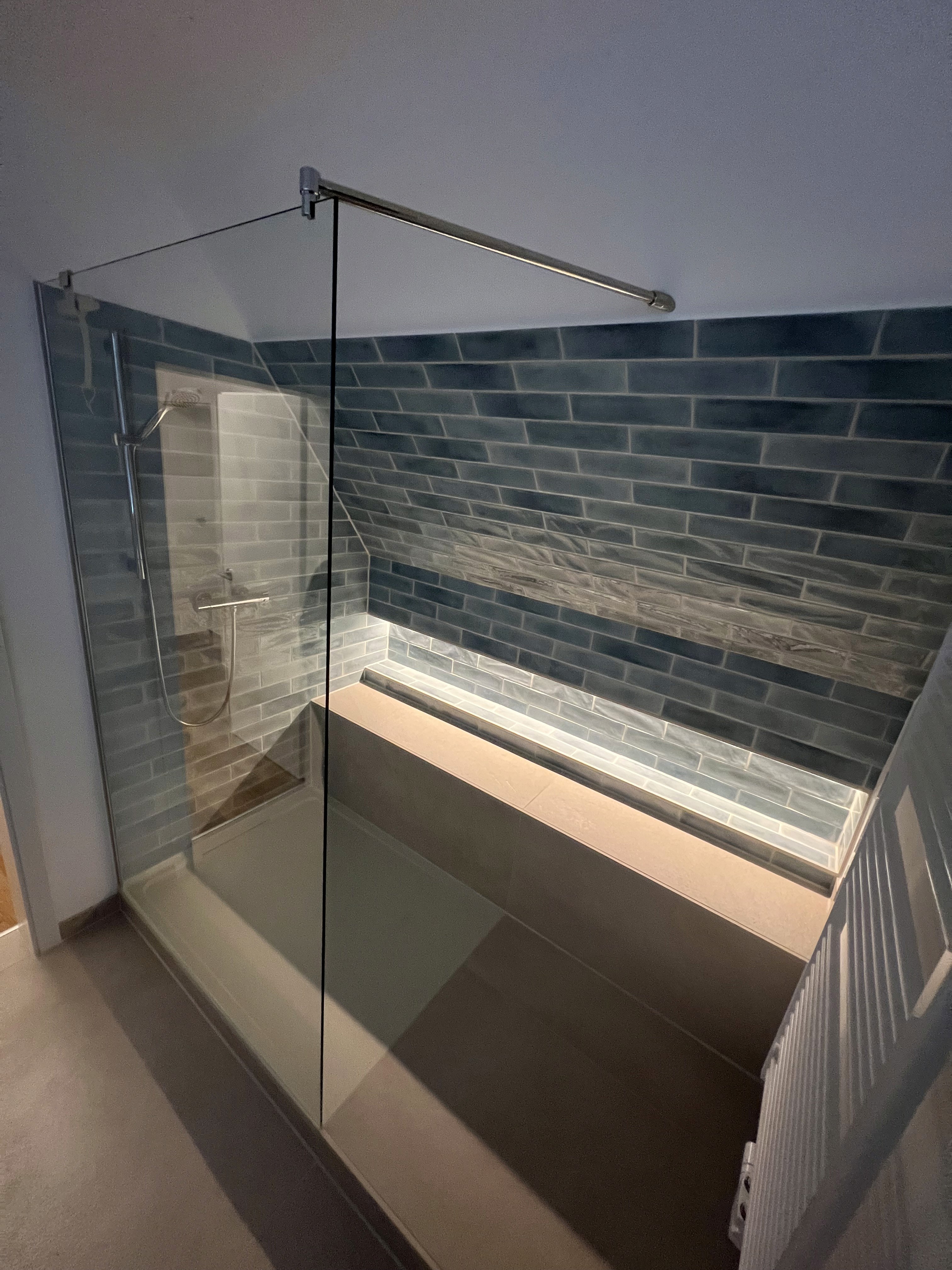 Die Walk-In Dusche ist über die gesamte Wandlänge von 2,70 m ausgeführt. Eine durchgehende, beheizte Sitz- und Ablagefläche bietet zusätzlichen Komfort und lädt zum Verweilen ein. Eine beleuchtete Nische ist flächenbündig integriert, während die bodengleiche Duschfläche mit rutschhemmender Oberfläche Sicherheit und Alltagstauglichkeit gewährleistet.