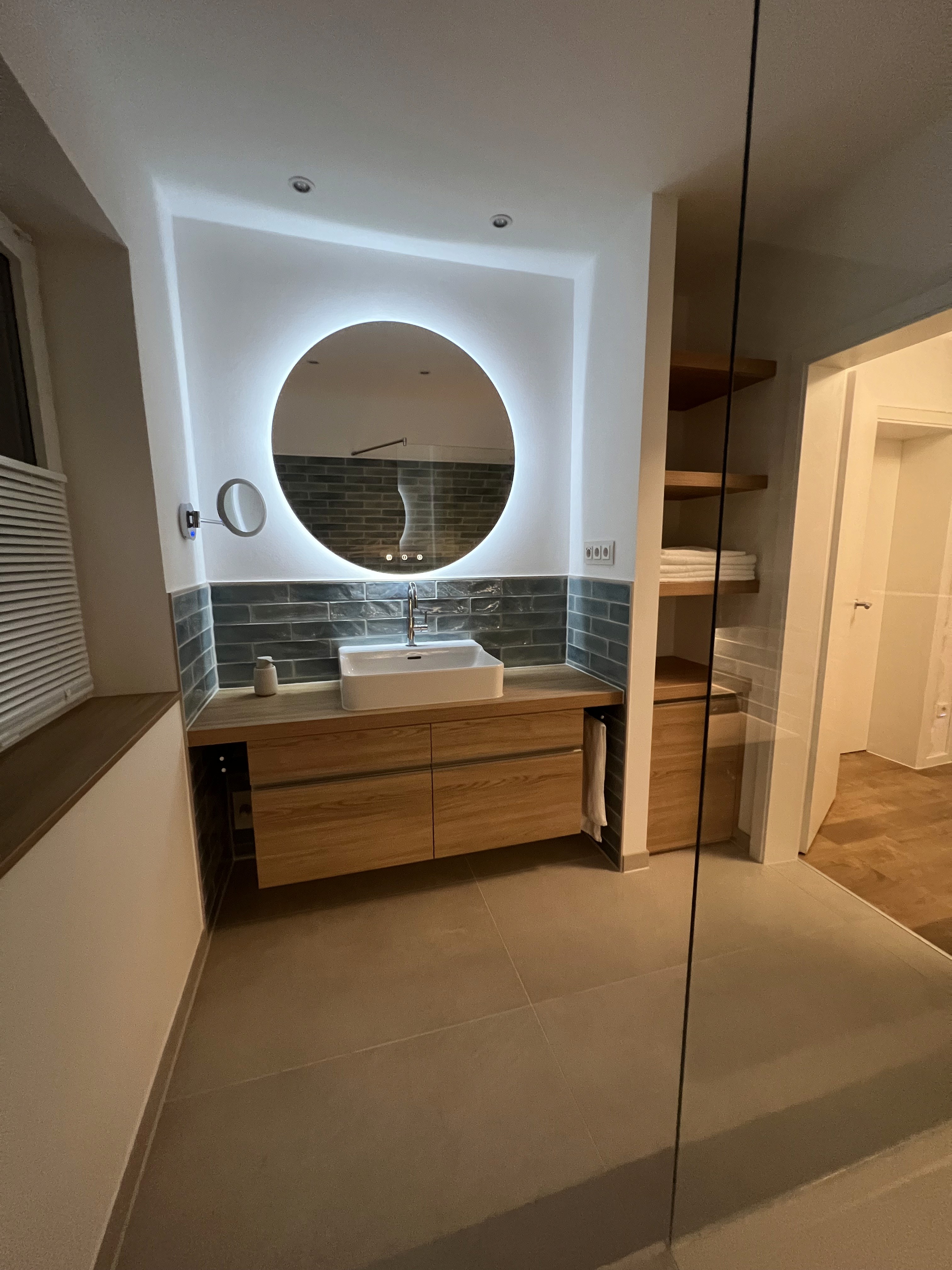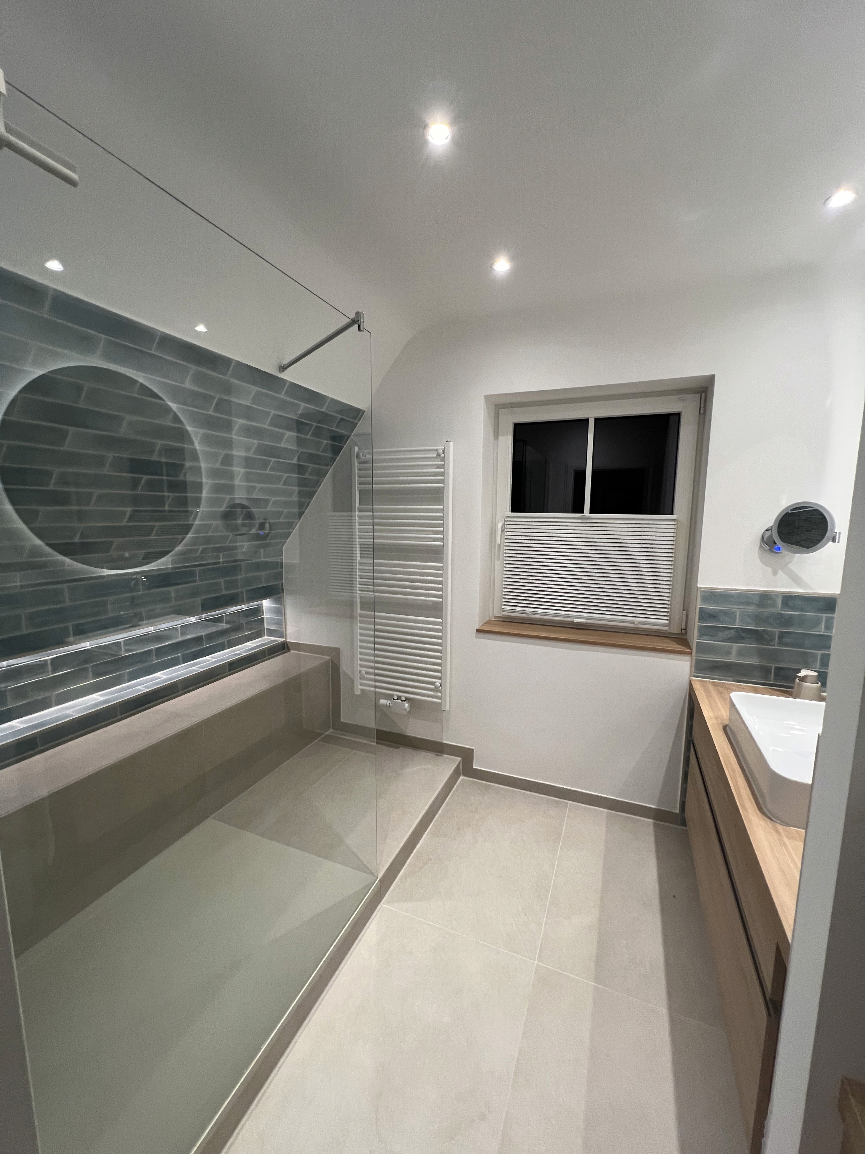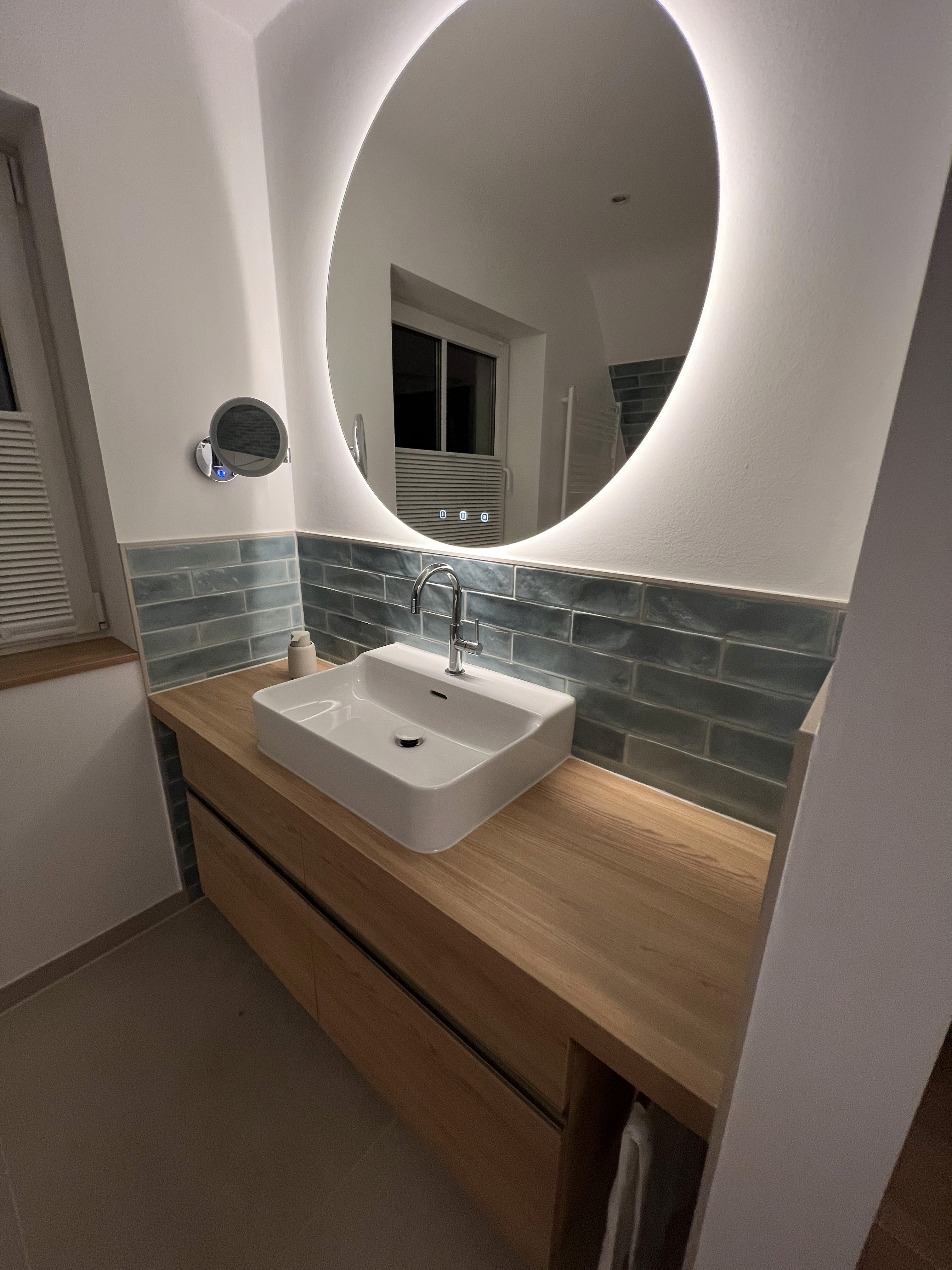 Petrolfarbene Metro-Fliesen stehen im bewussten Kontrast zu sandfarbenen Wand- und Bodenflächen. Die klare Linienführung der Fliesen bringt Struktur in den Raum, während das runde, ein Meter große Spiegelobjekt die überwiegend rechteckige Geometrie visuell ausgleicht.