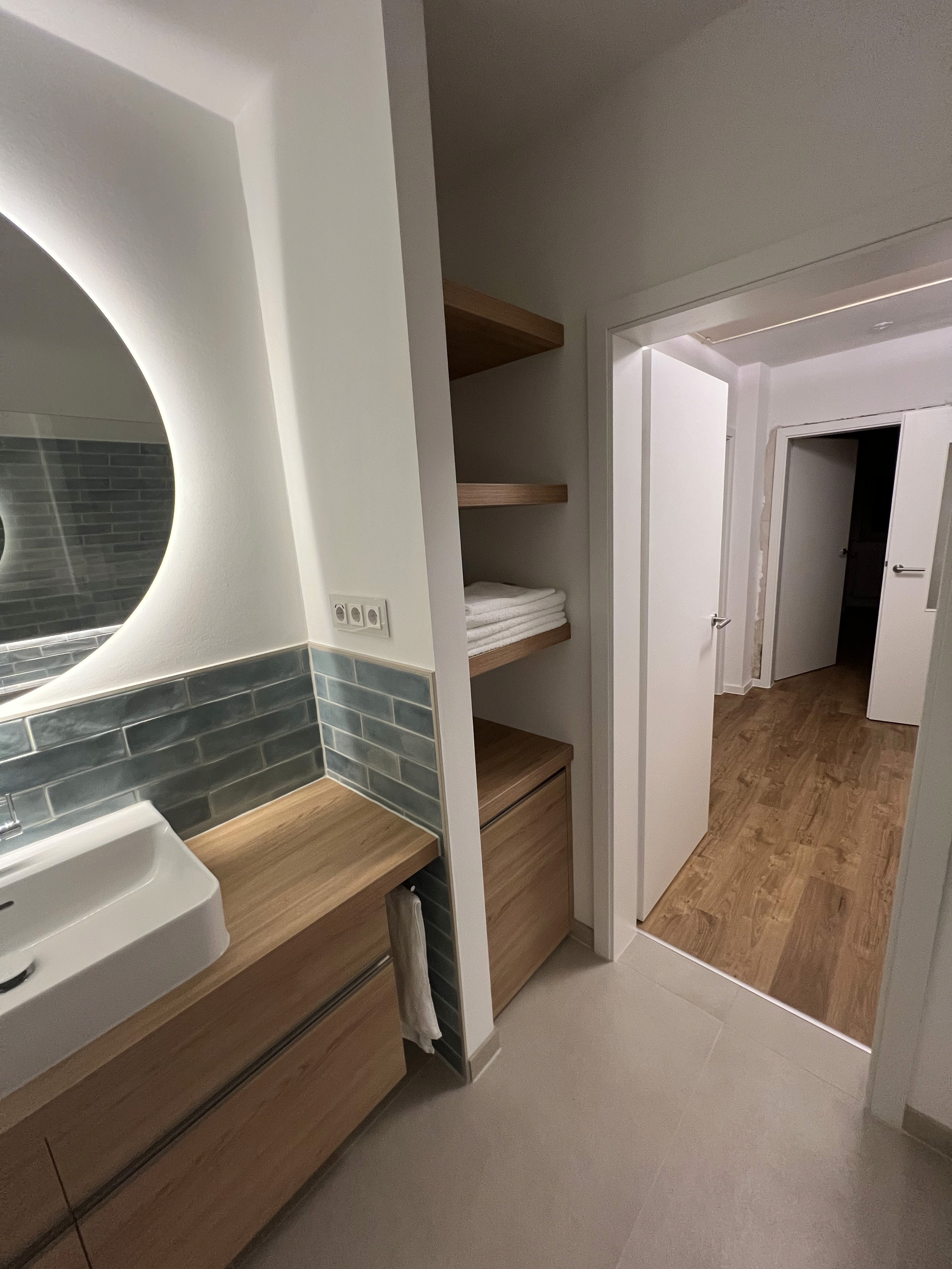 Waschtisch, Unterschrank und Wandregale wurden vollständig maßgefertigt und präzise in die Architektur integriert. Die Schubladen verfügen über integrierte Steckdosen und eine innenliegende Beleuchtung, während ausziehbare Handtuchhalter den Nutzwert funktional erweitern – zurückhaltend und unaufdringlich.