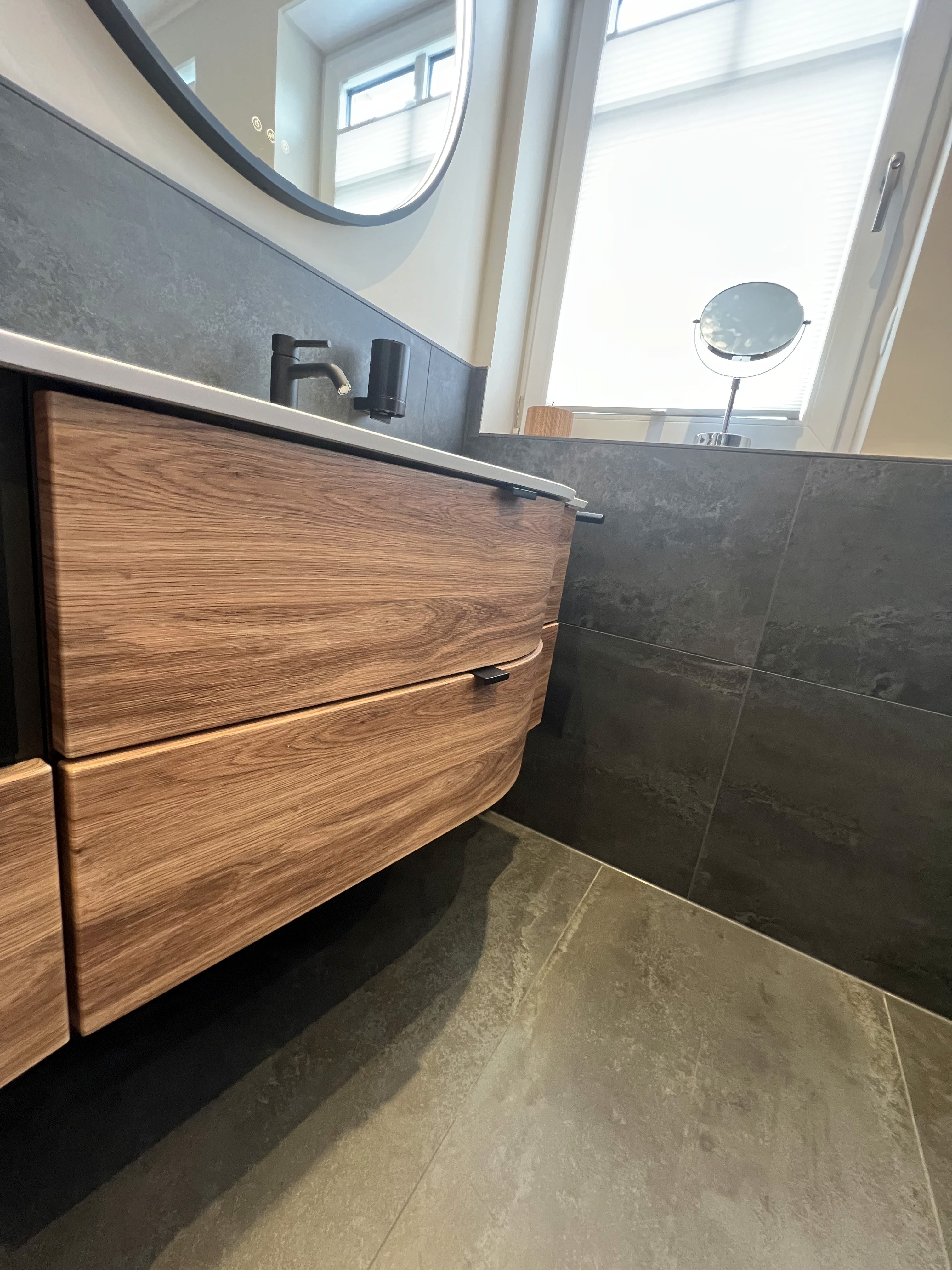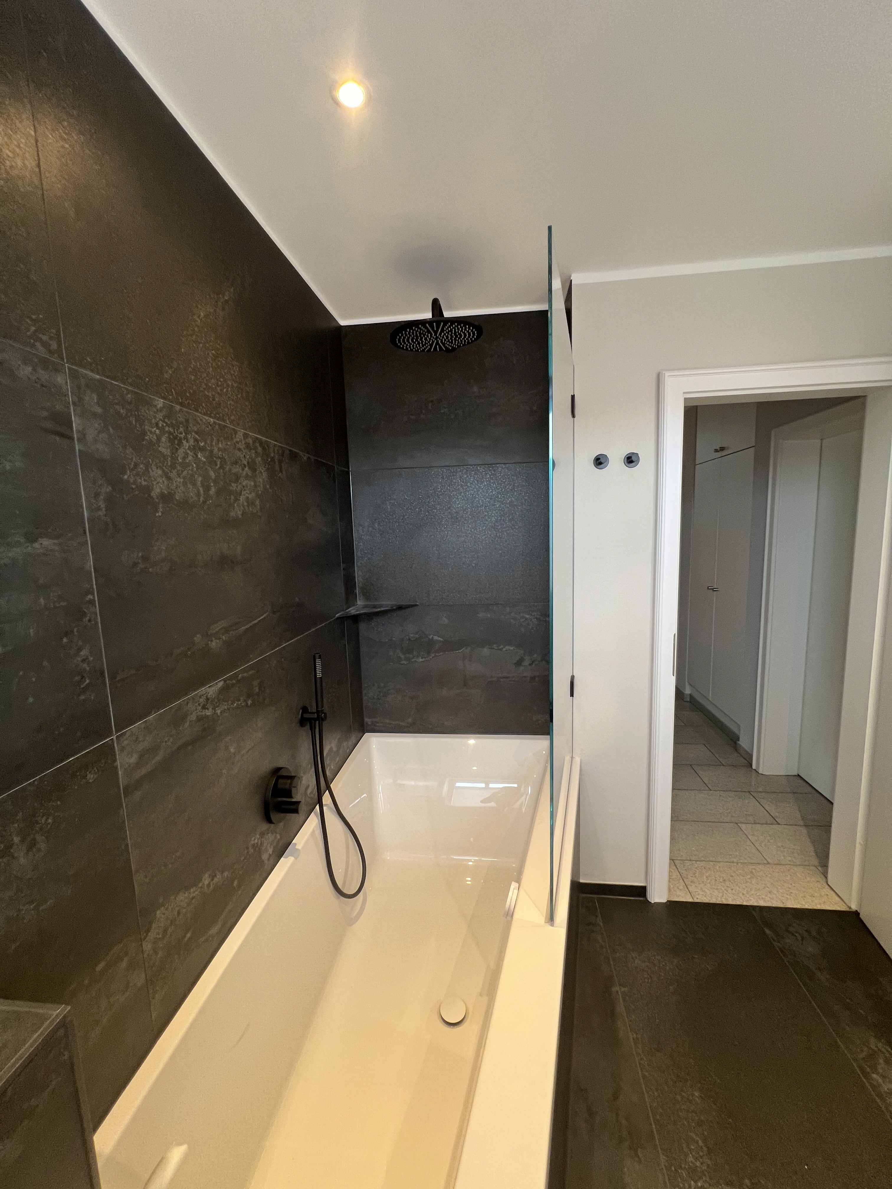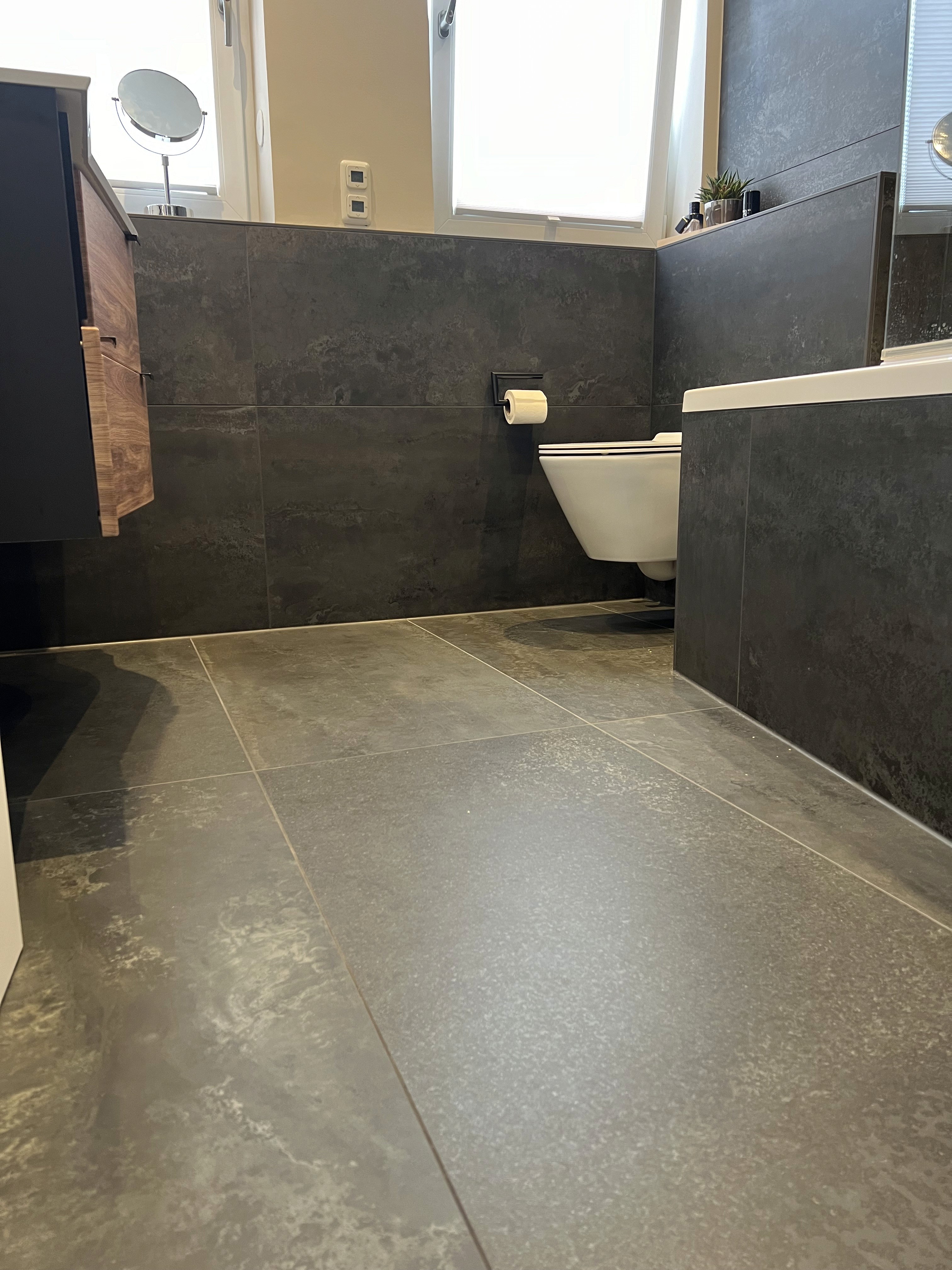 Großformatige Keramikfliesen im Format 60 × 120 cm mit lebhafter Anthrazit-Struktur geben dem Bad Tiefe und eine gewisse Lebendigkeit. Die durchgängige Materialität unterstützt die klare Linienführung und lässt den Raum trotz dunkler Farbgebung ausgewogen wirken.