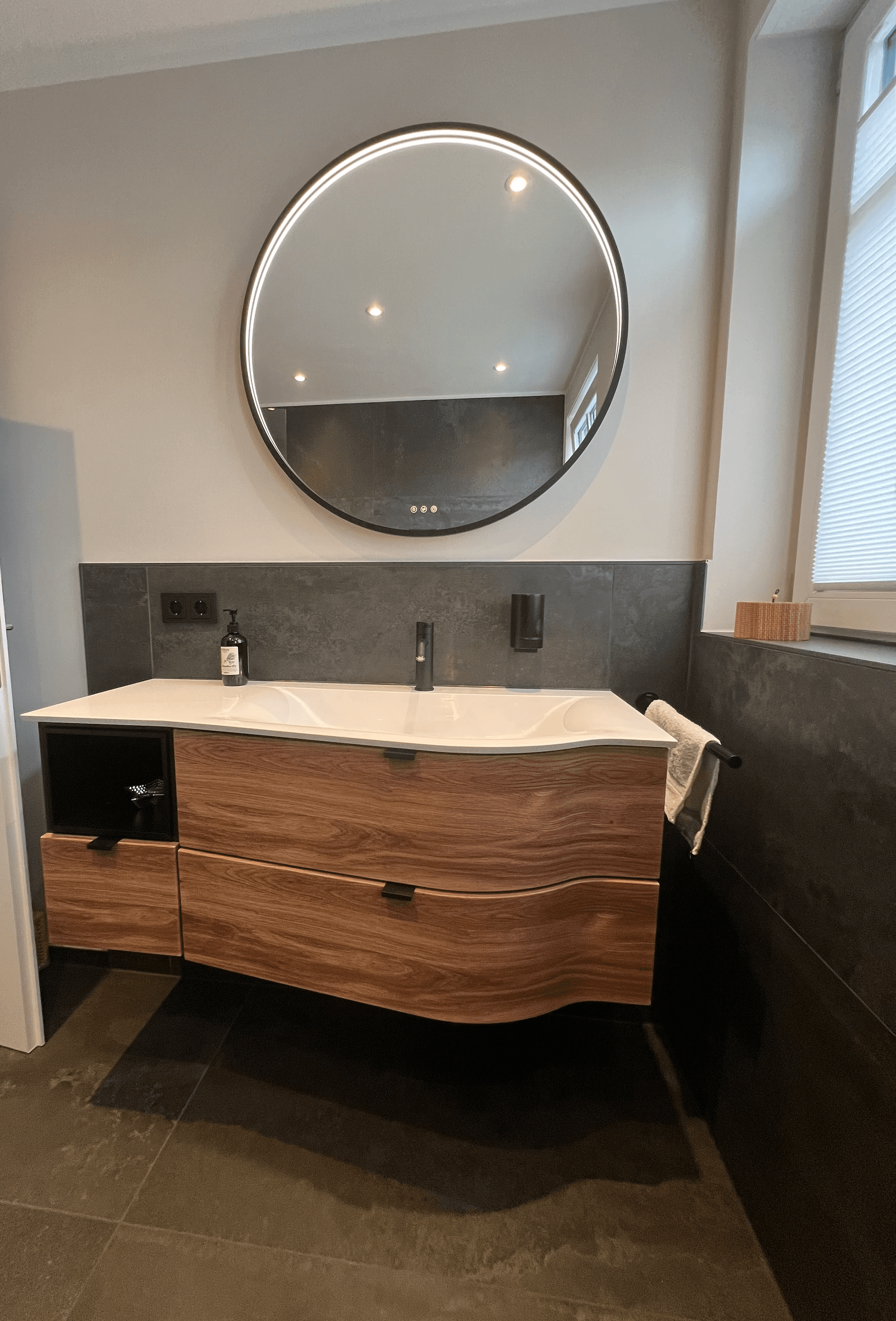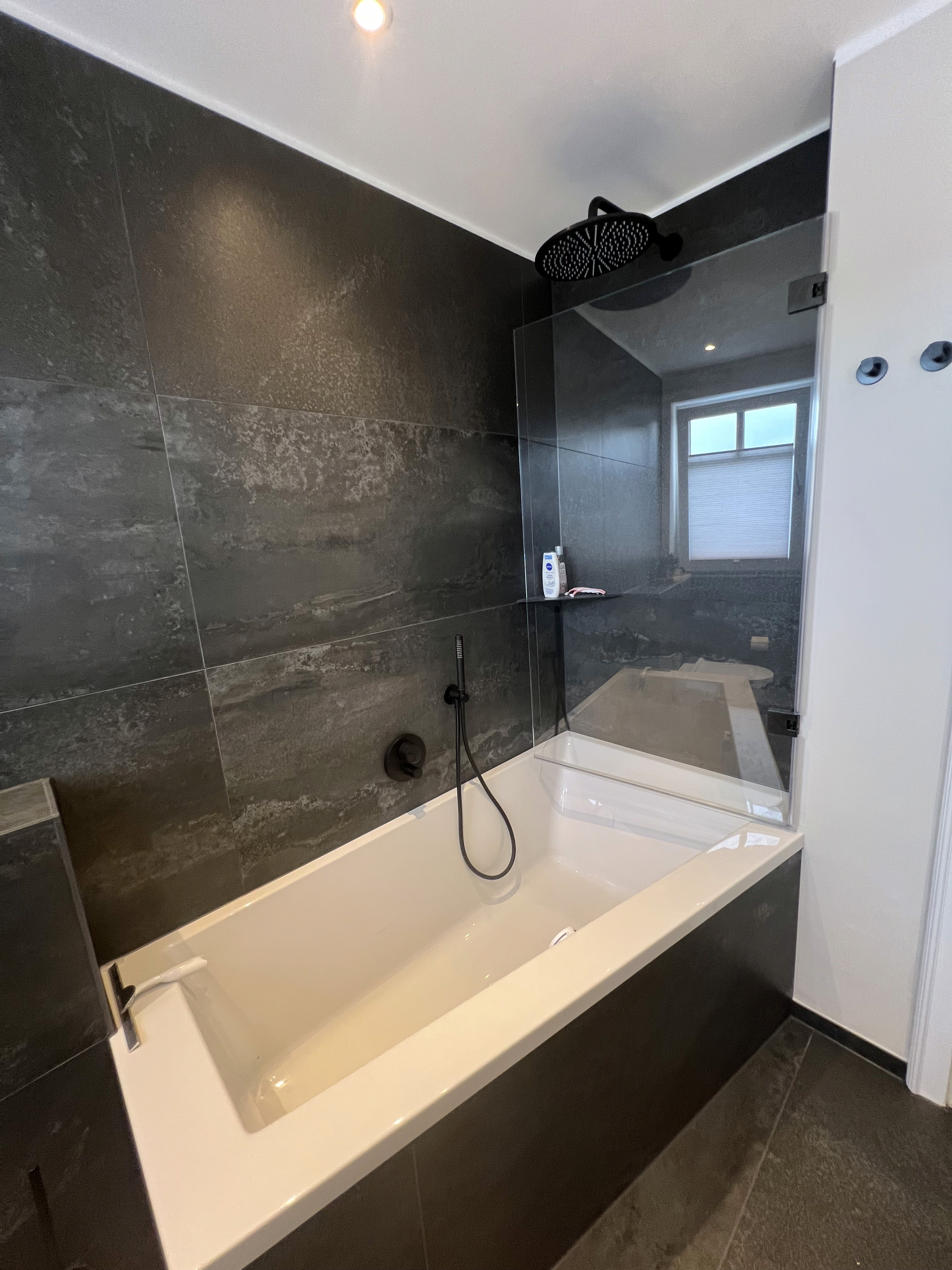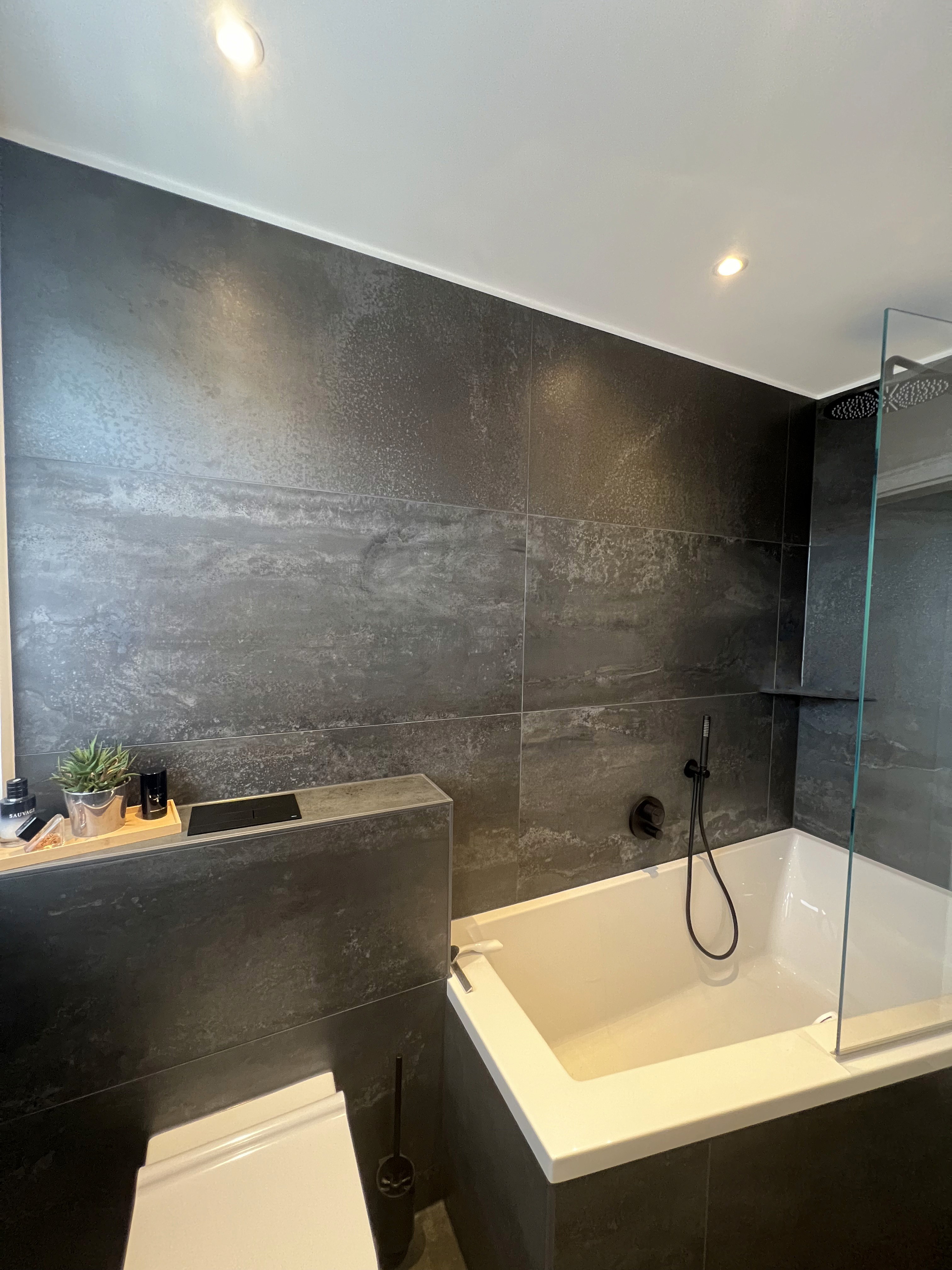 Großformatige Keramikfliesen im Format 60 × 120 cm mit lebhafter Anthrazit-Struktur geben dem Bad Tiefe und eine gewisse Lebendigkeit. Die durchgängige Materialität unterstützt die klare Linienführung und lässt den Raum trotz dunkler Farbgebung ausgewogen wirken.
