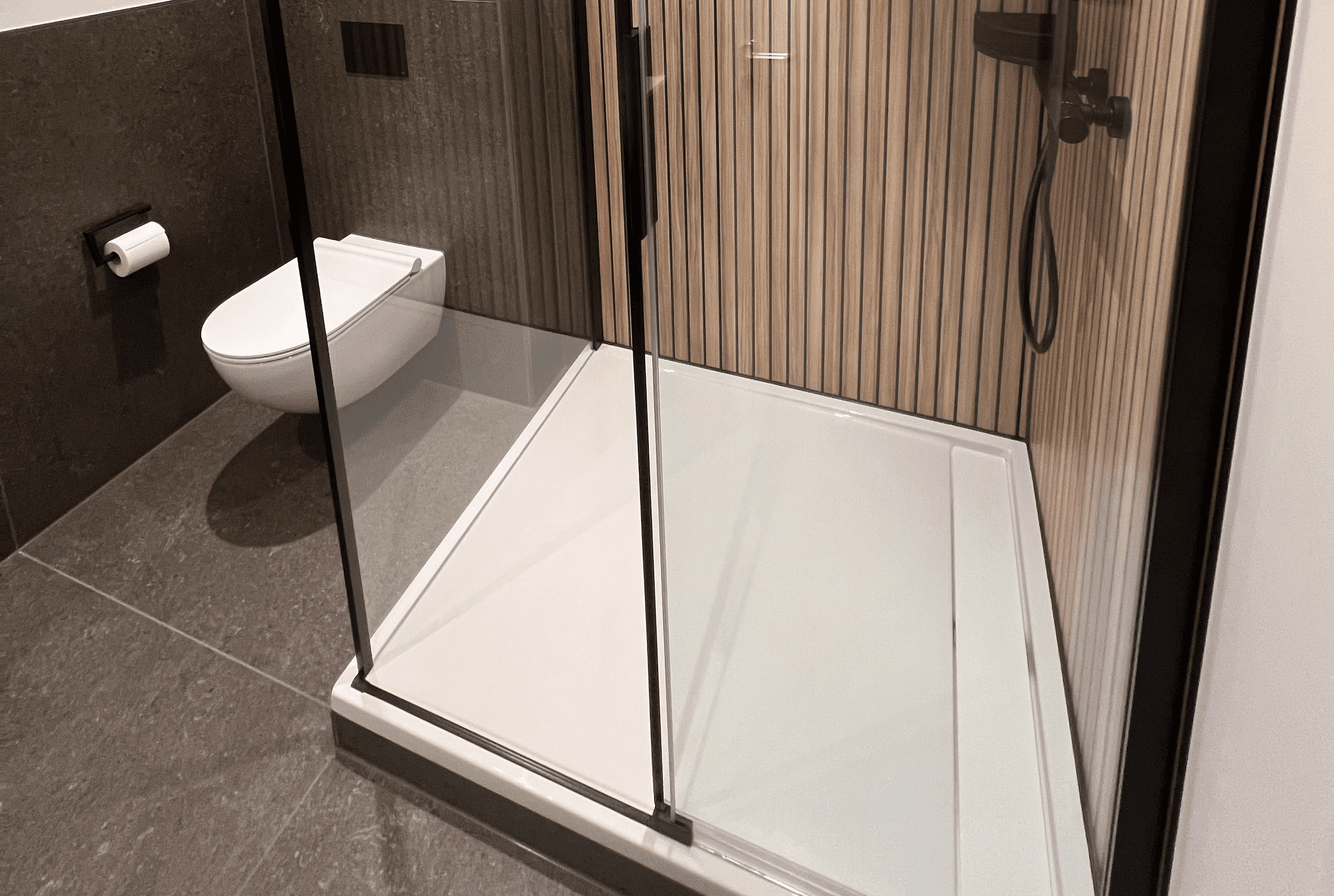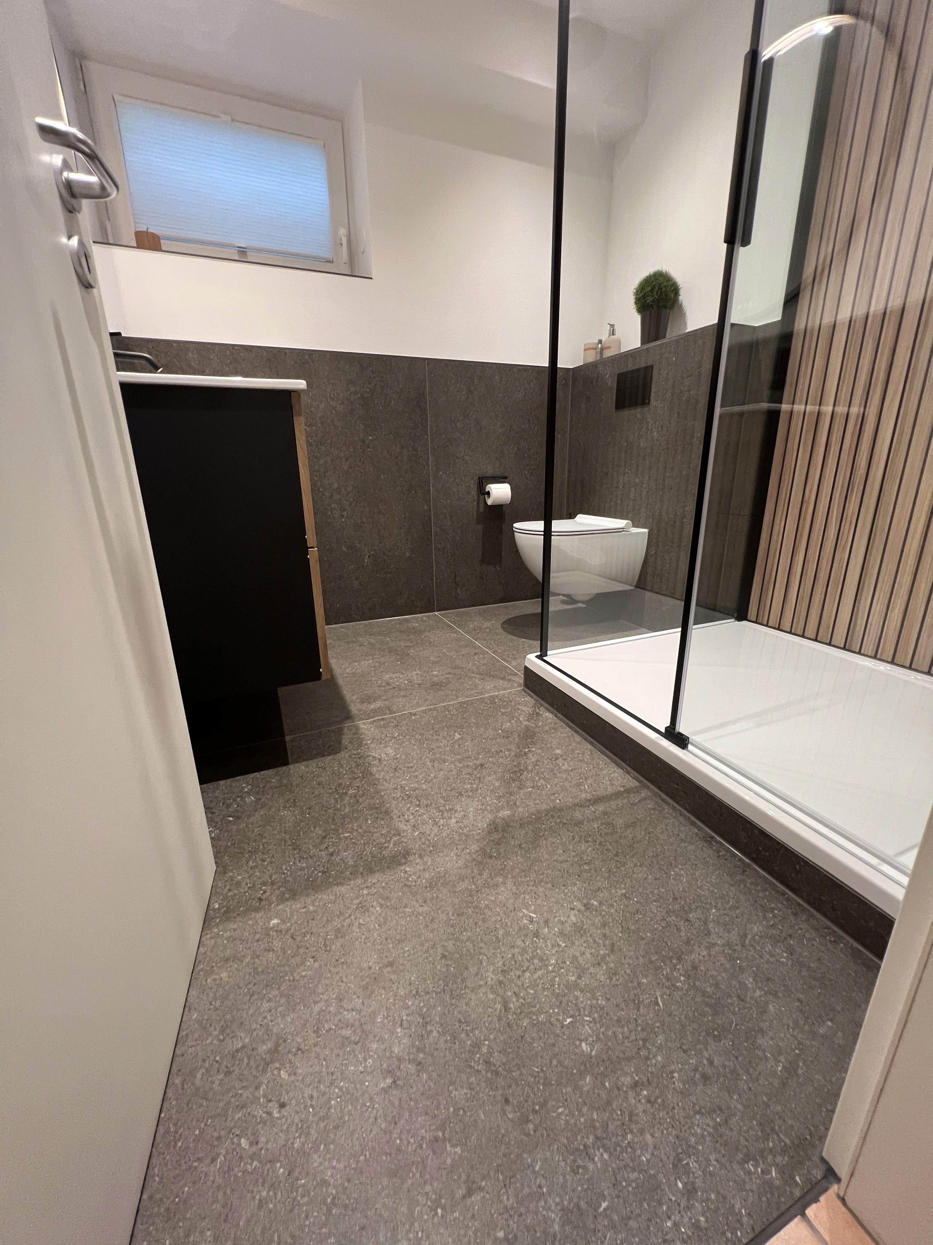 Die Raumaufteilung folgt einer klaren Trennung von Dusche, WC und Waschtisch, um Übersicht und Bewegungsfreiheit auch auf begrenzter Fläche zu gewährleisten. Die Konstruktion der Duschzone wurde so ausgelegt, dass alle Elemente gut zugänglich bleiben und der Raum langfristig einfach zu reinigen ist.