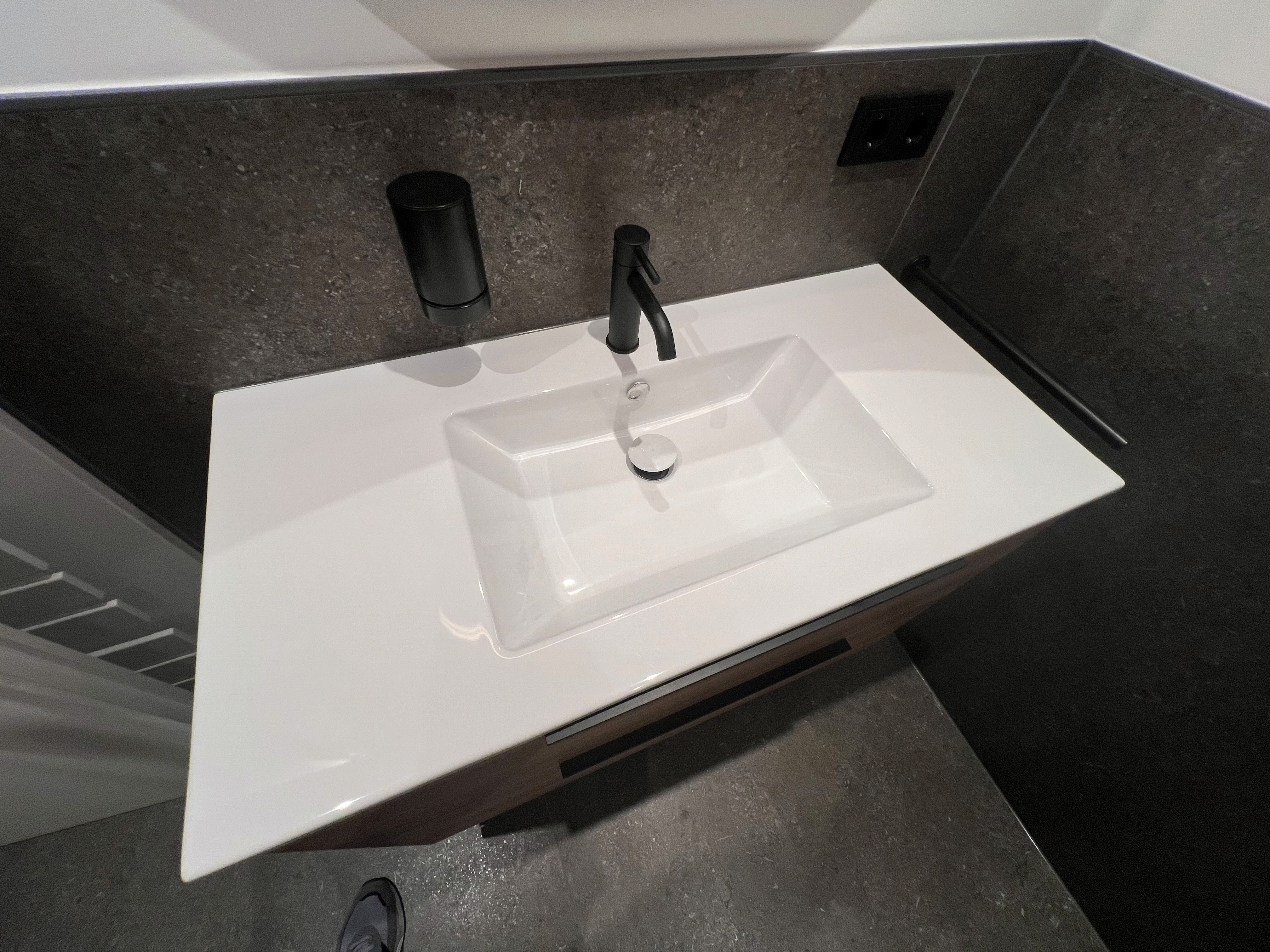 In der Duschkabine kommen großformatige HPL-Platten zum Einsatz. Die Schiebetürkonstruktion ermöglicht eine einfache Demontage der Türen über ein Clicksystem für eine gründliche Reinigung. Duschwände und Waschtischanlage sind konstruktiv aufeinander abgestimmt und bilden eine durchgängige Einheit.