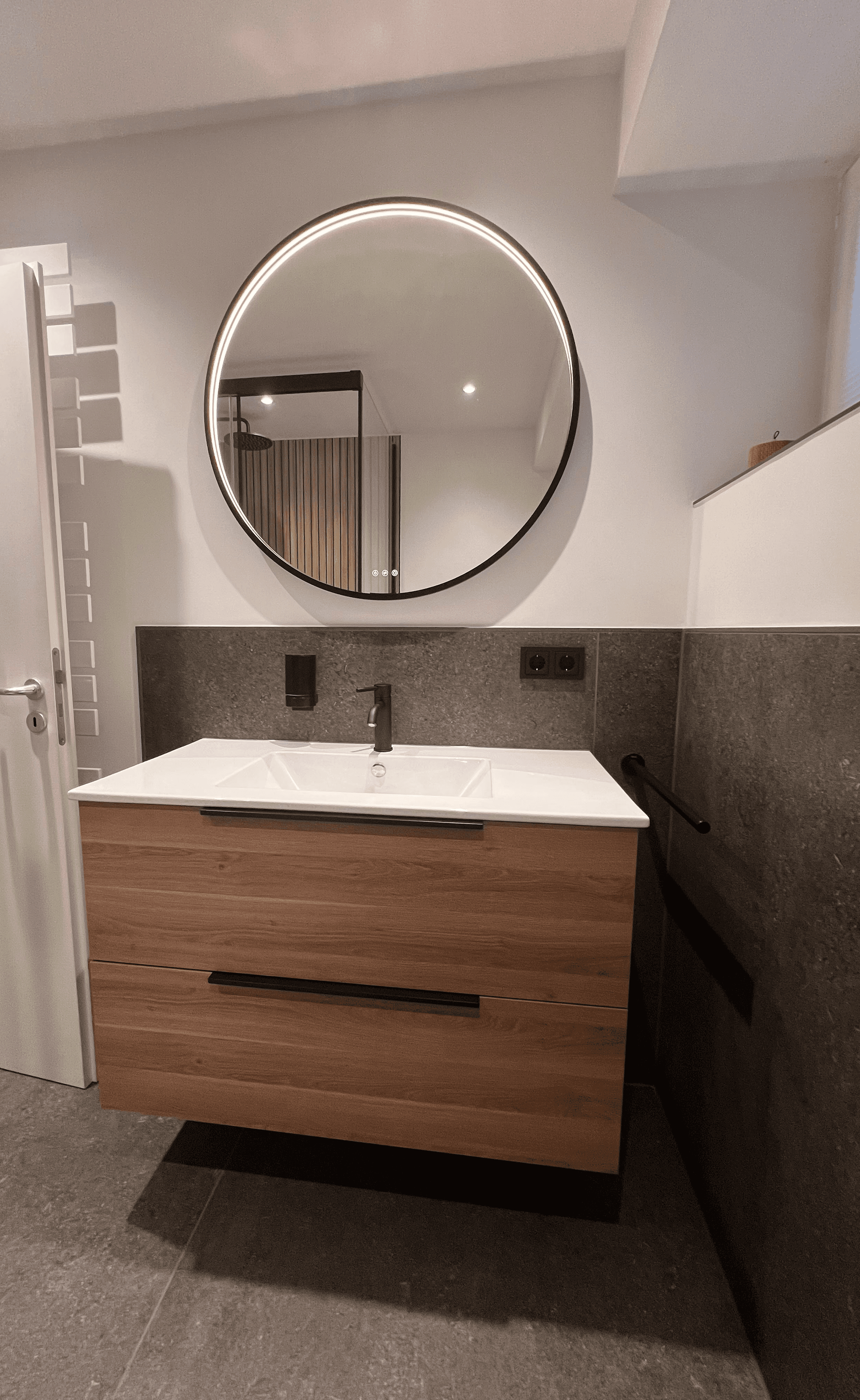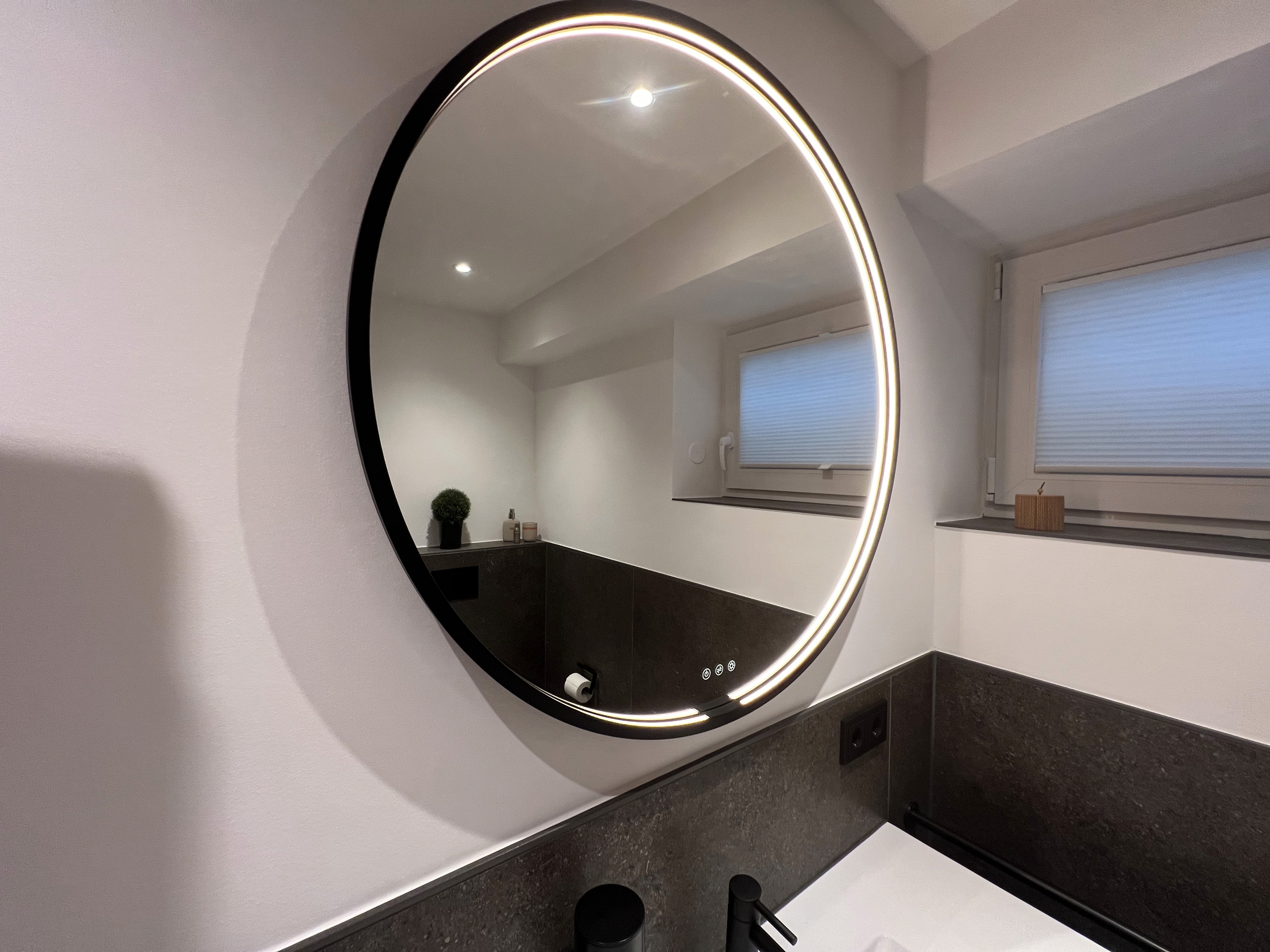 Das Zusammenspiel aus klaren Flächen, reduzierter Farbigkeit und präzisen Linien verleiht dem Gästebad eine ruhige, aufgeräumte Wirkung. Das runde Spiegelobjekt verfügt über eine einstellbare Lichtfarbe und Intensität.