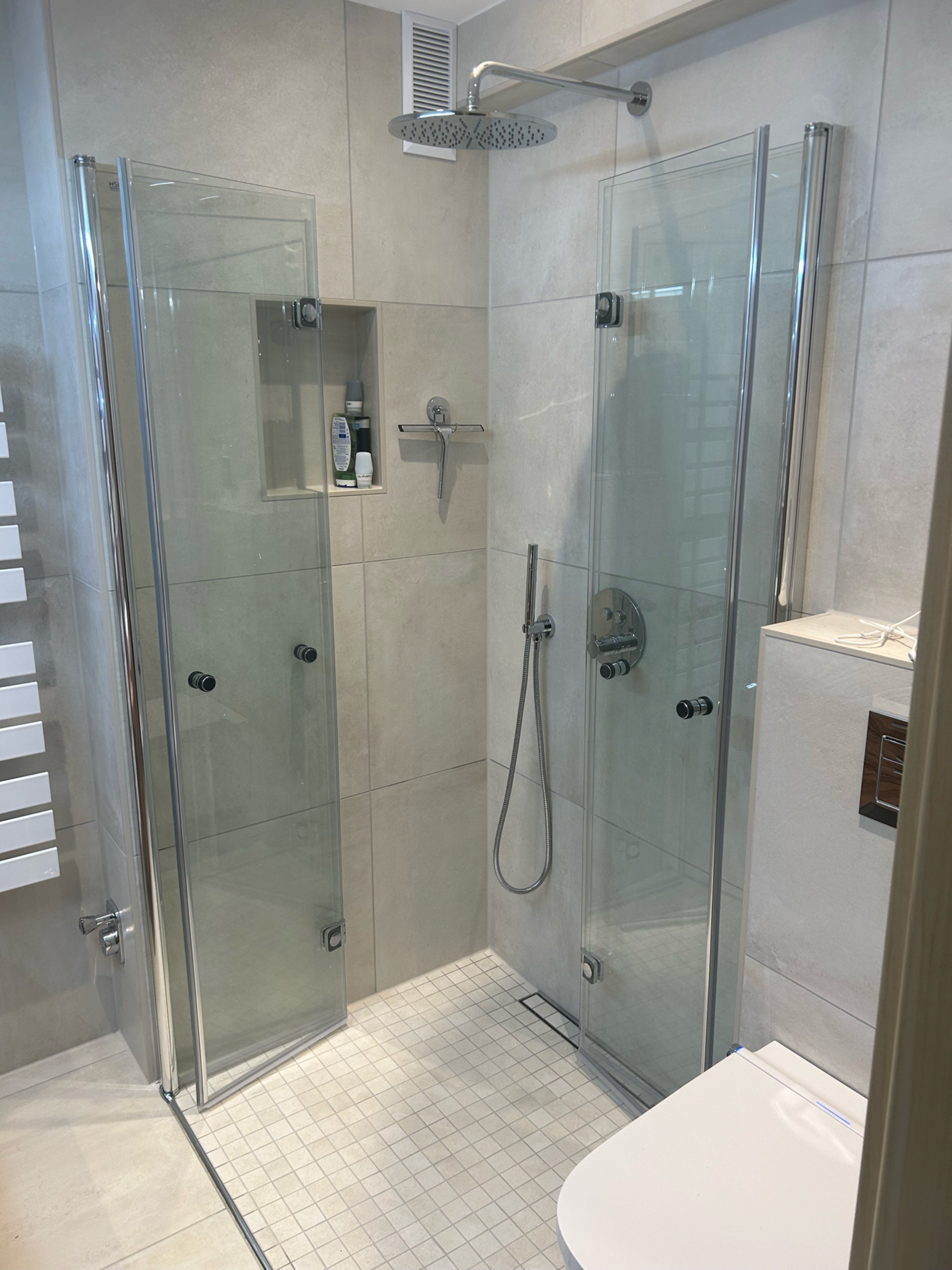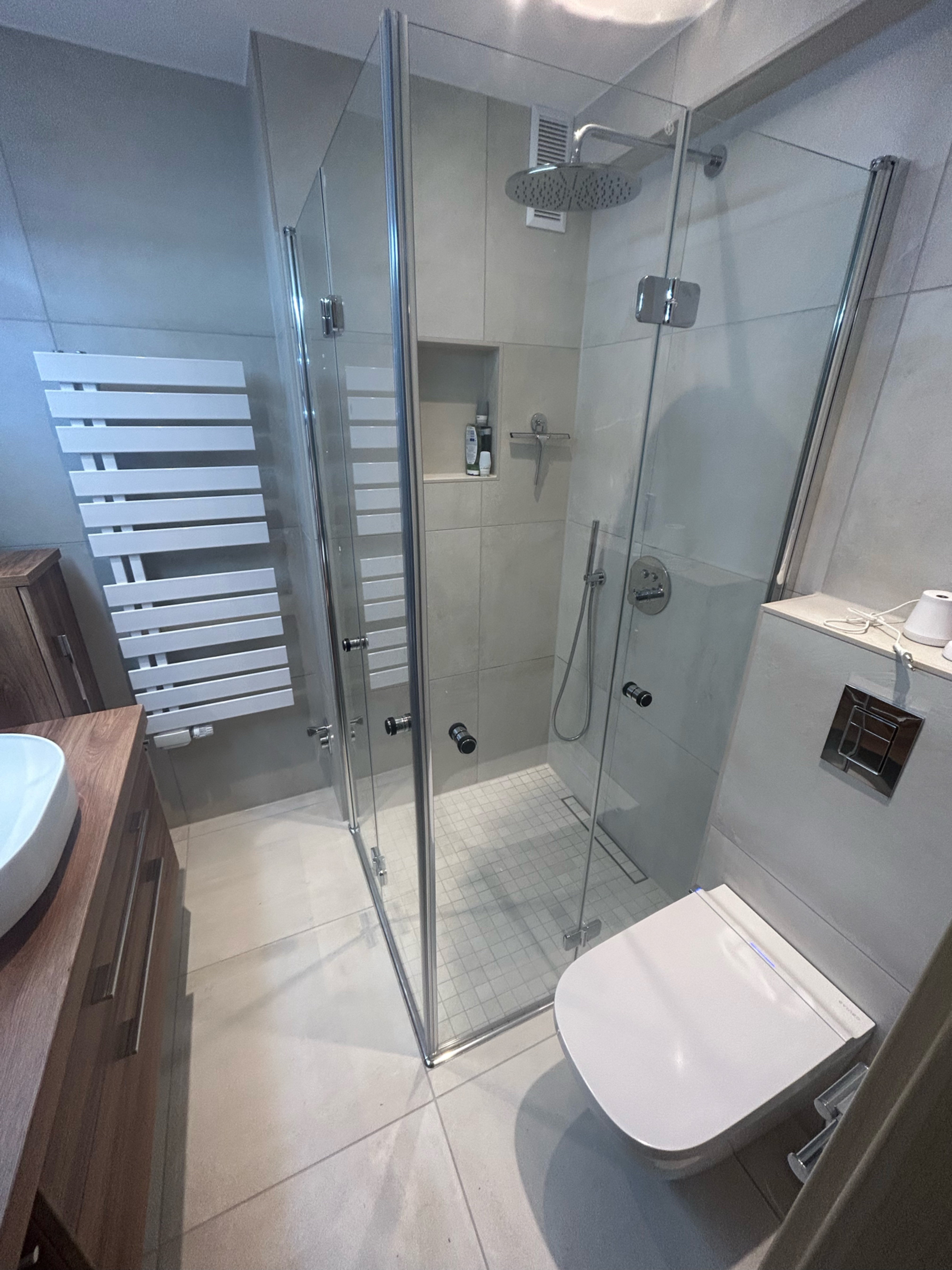 Im Zuge der Umplanung wurde die Badewanne durch eine Dusche ersetzt. Um den engen Abstand zwischen Duschzone und Waschtischanlage optimal zu lösen, kamen faltbare Duschtüren zum Einsatz. Im geöffneten Zustand schaffen sie zusätzlichen Bewegungsraum und erleichtern die tägliche Nutzung.