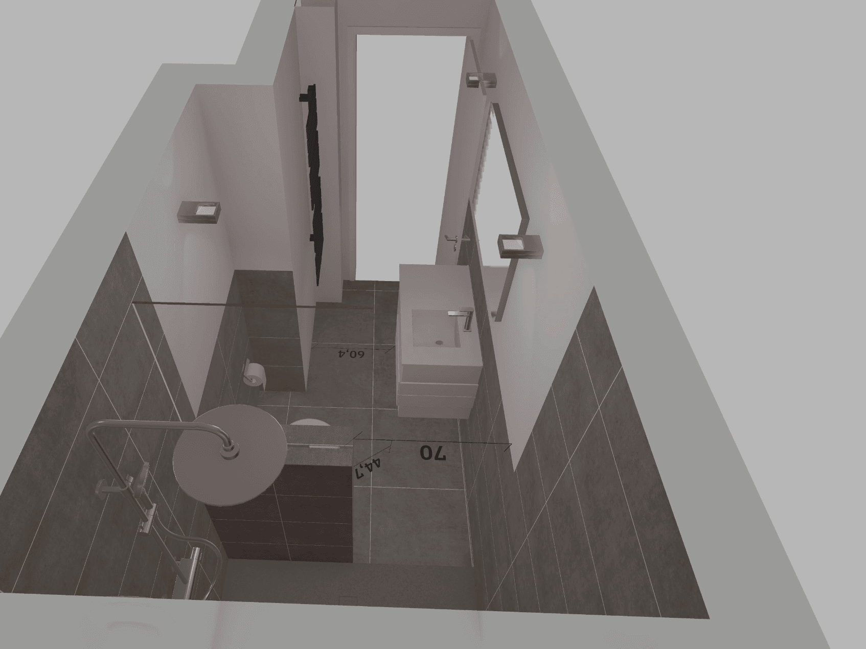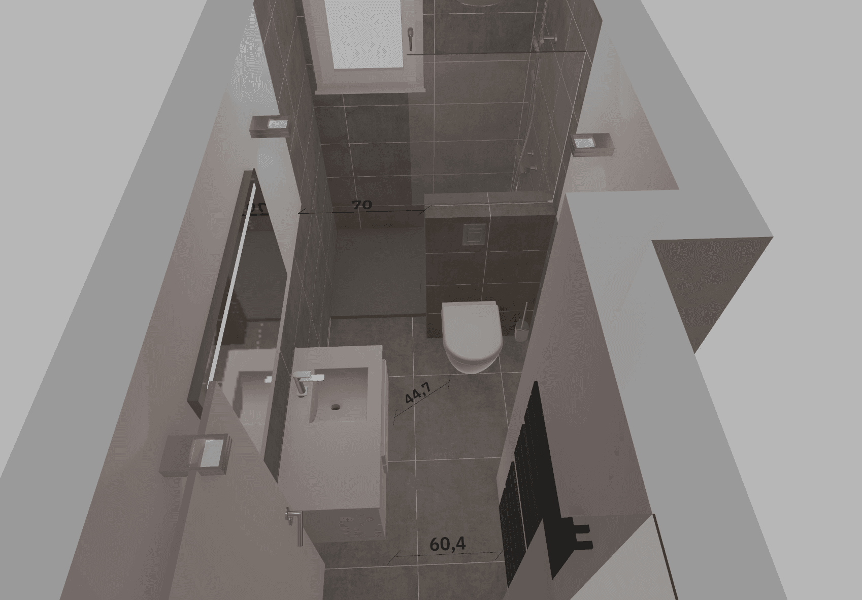 Ein beleuchteter Wandspiegel ergänzt die Gestaltung und unterstützt die optische Weitung des schmalen Badezimmers.