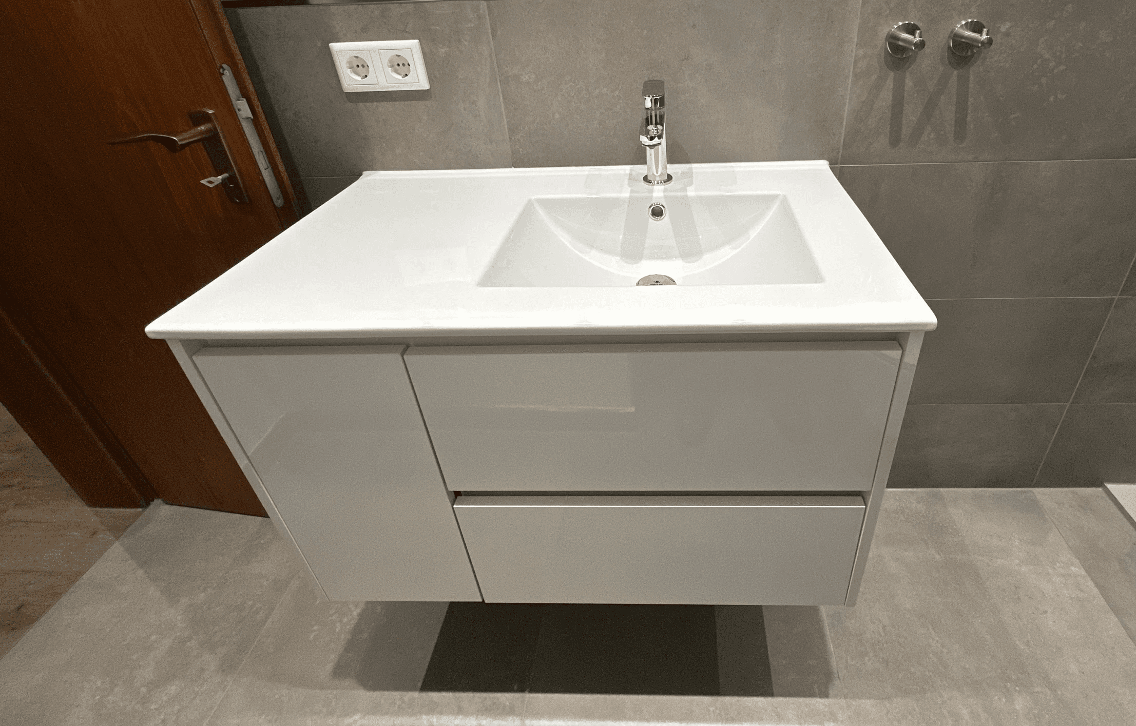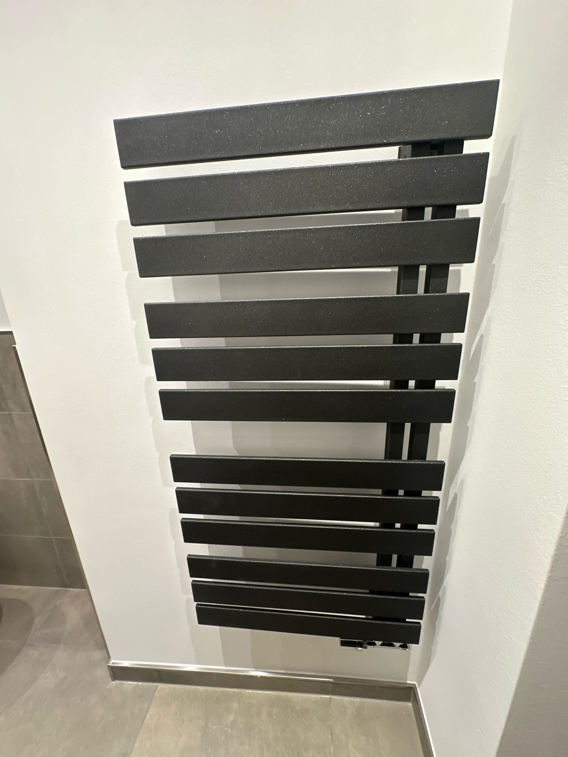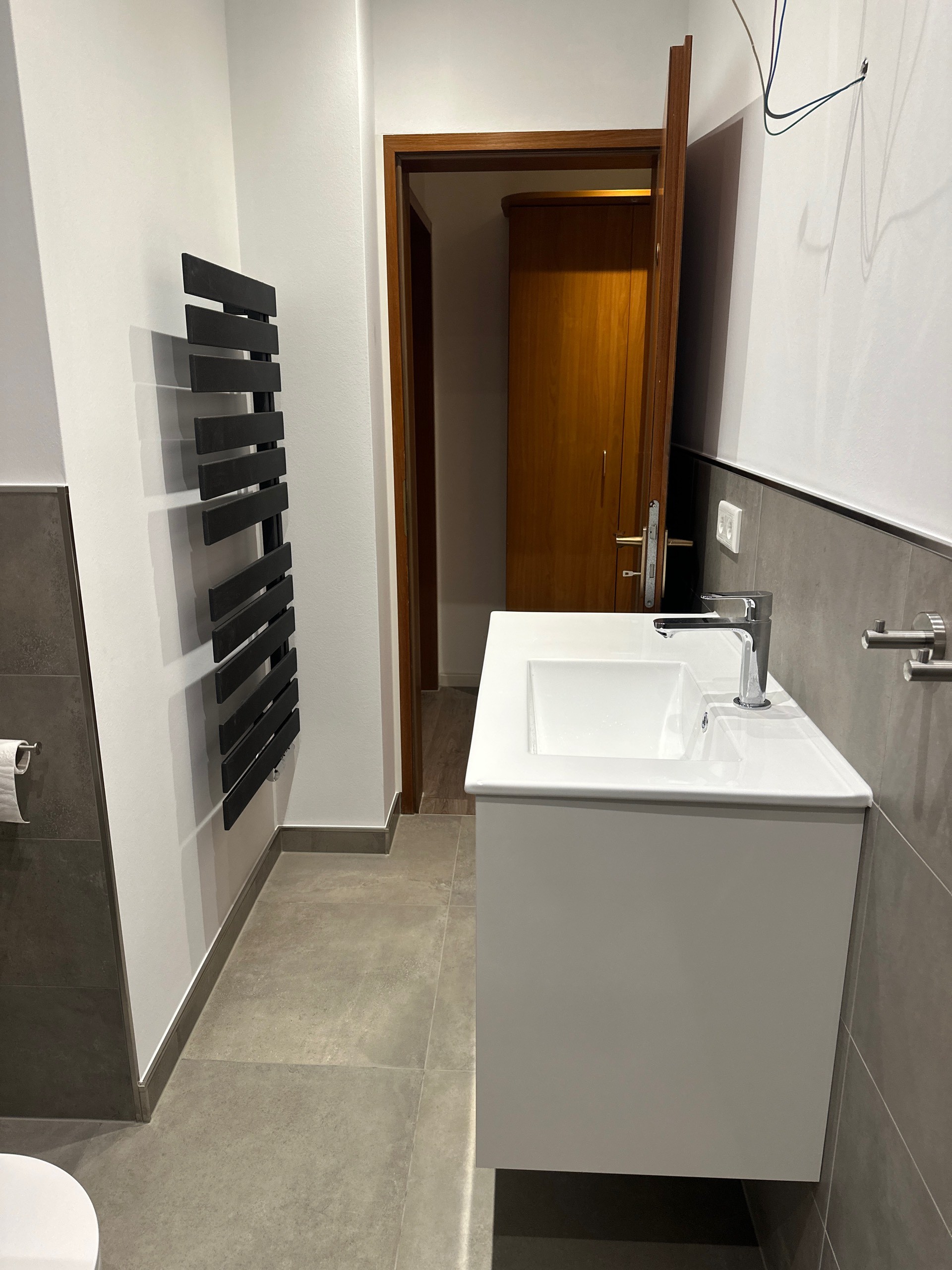 Der Waschtisch verfügt über eine großzügige Ablagefläche sowie ausreichend Stauraum. Der alte Heizkörper wurde durch einen flachen, modernen Handtuchheizkörper ersetzt, der sich platzsparend in das Raumkonzept einfügt.
