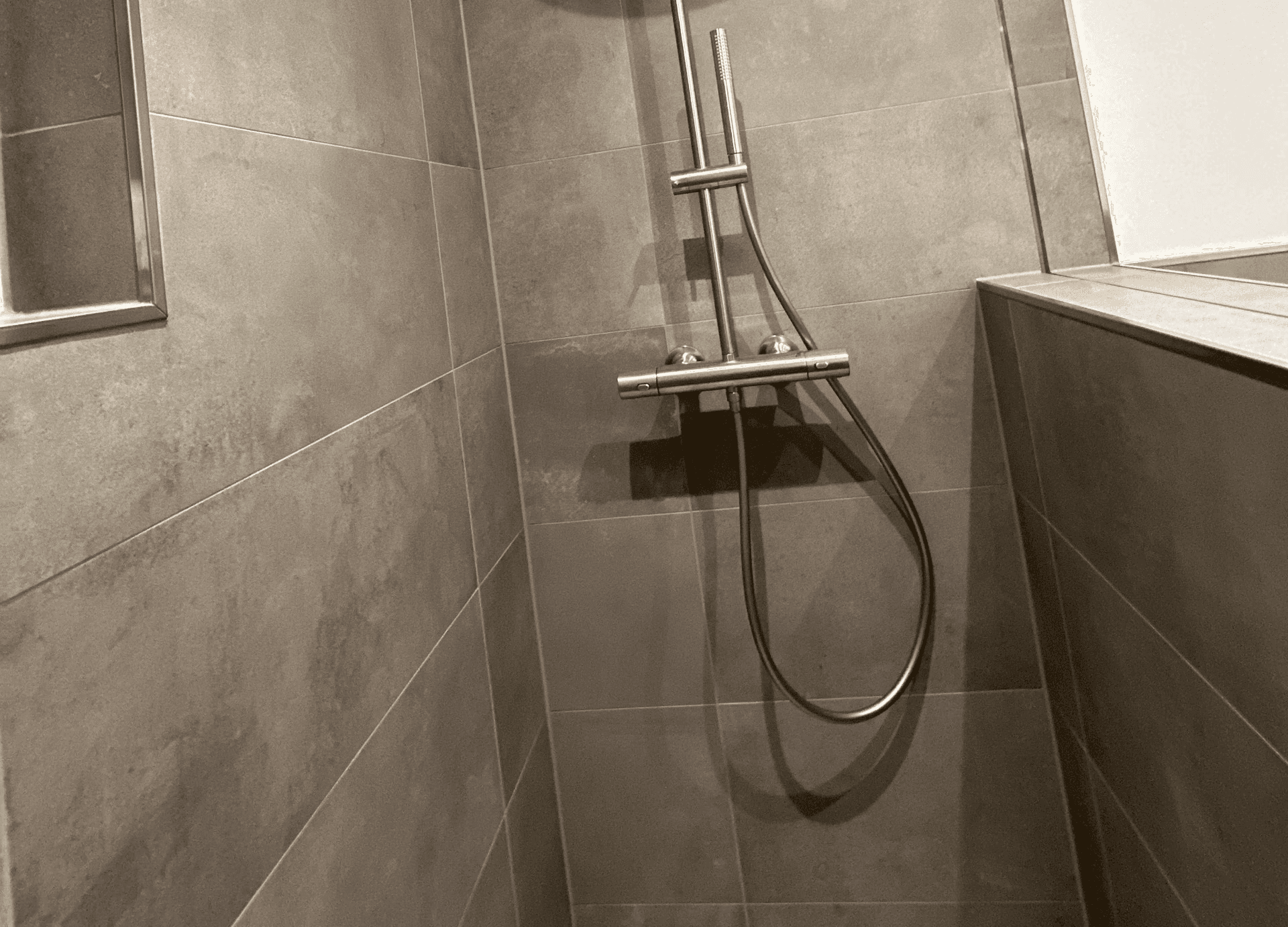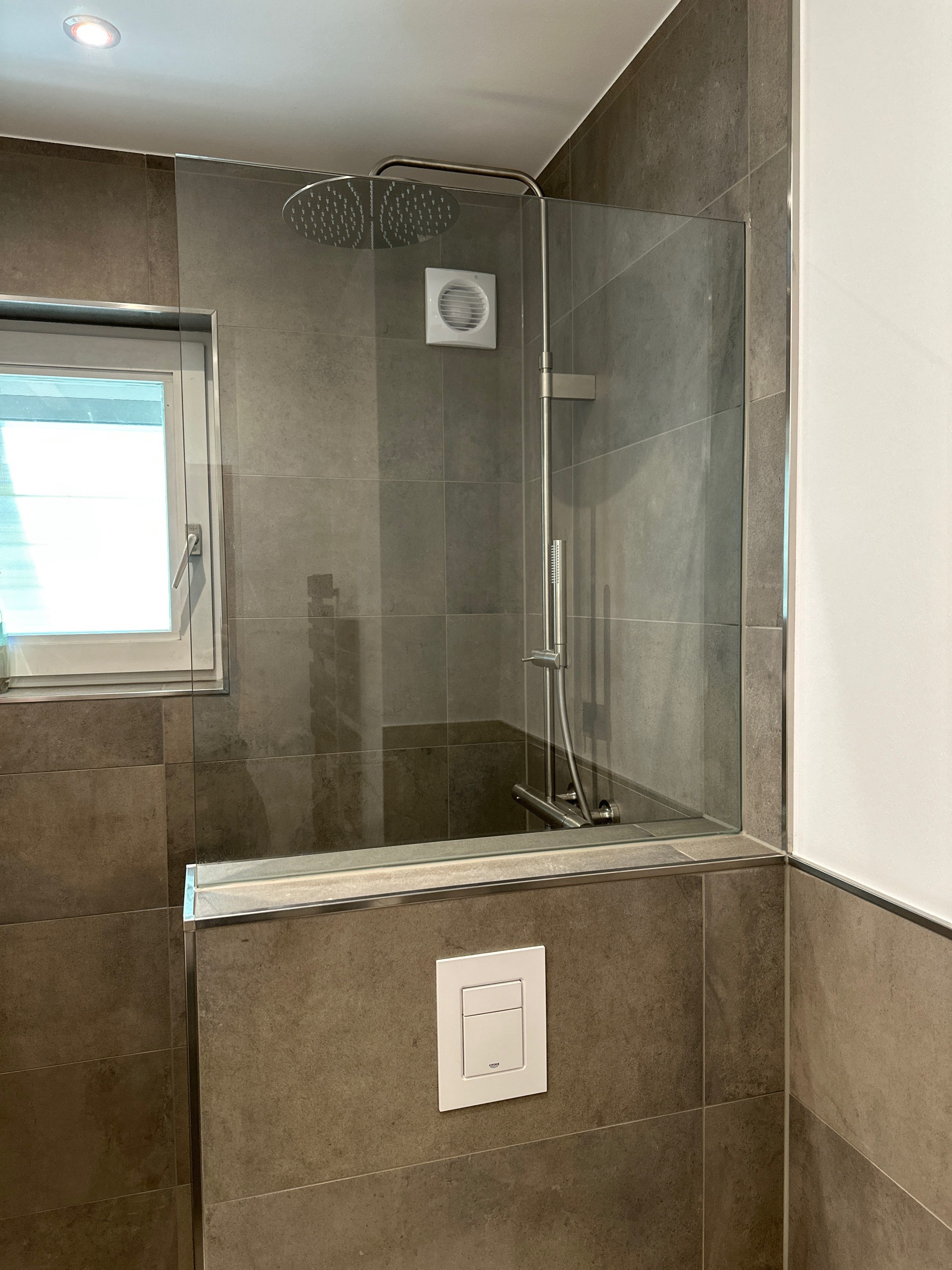 Auf Wunsch des Kunden wurde die bestehende Badewanne mit Duschfunktion durch eine bodengleiche Dusche ersetzt. Da sich das Badezimmer im Erdgeschoss befindet, konnte ein niveaugleicher Einbau technisch umgesetzt werden.