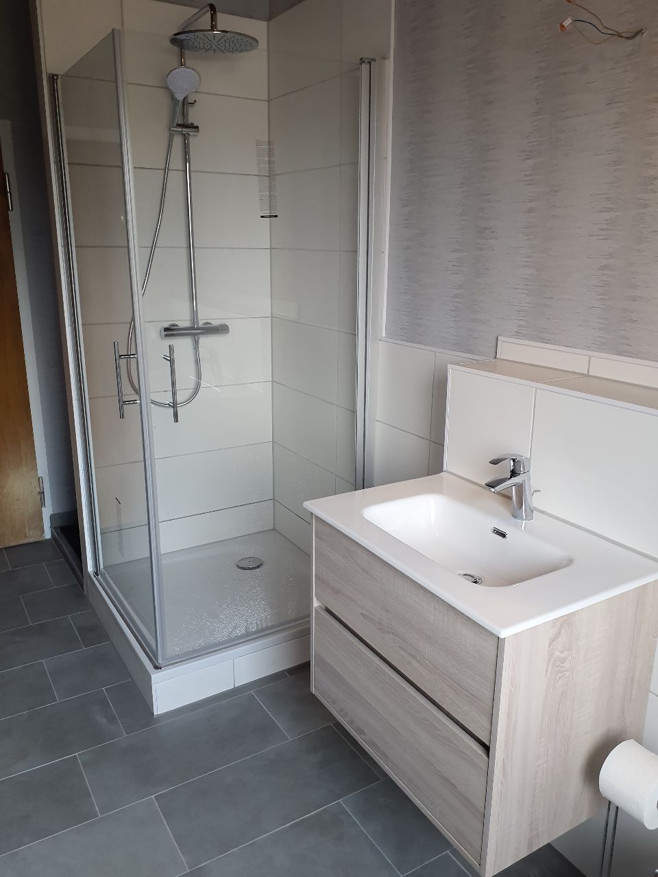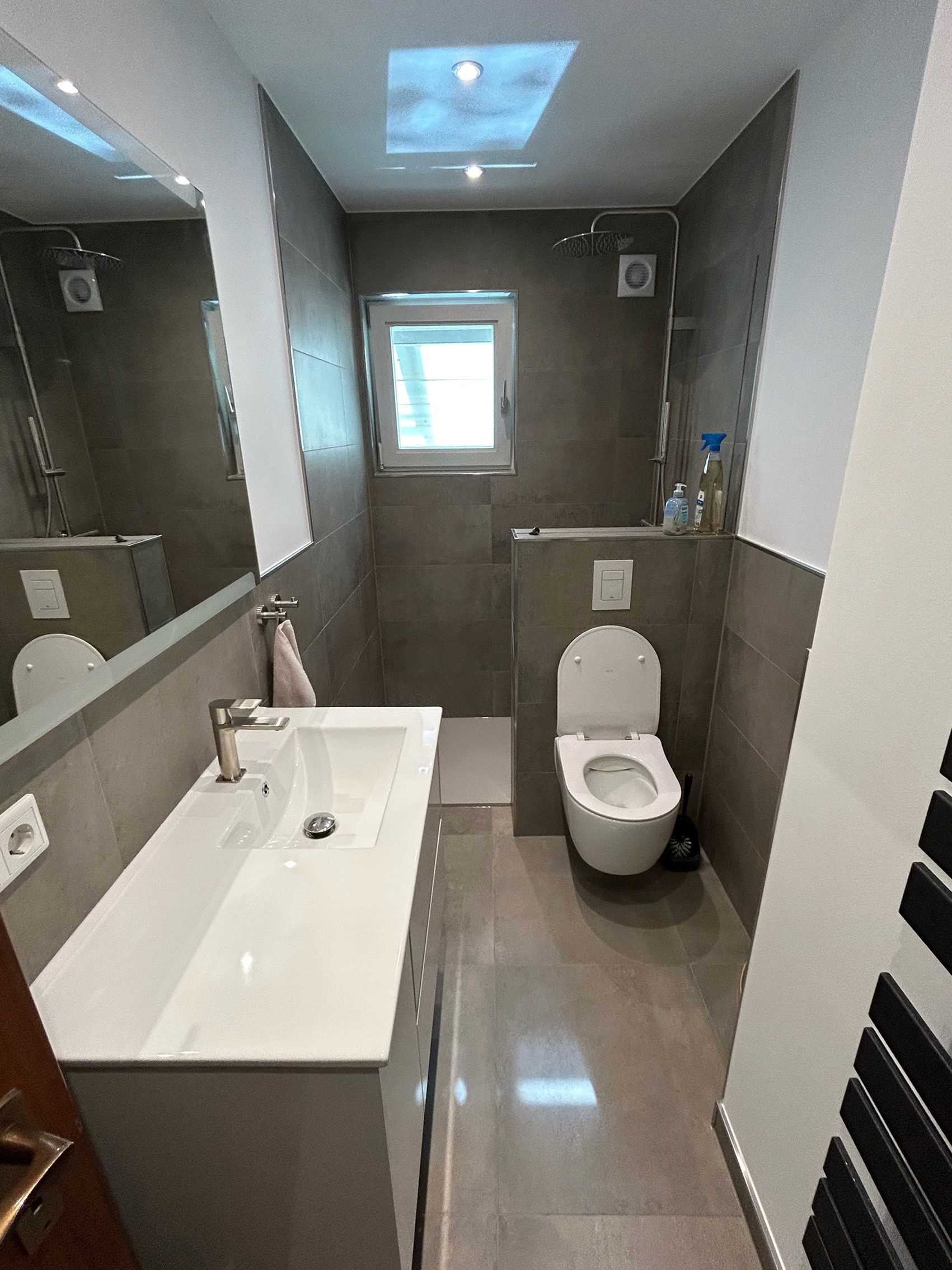 Ein modernes, funktionales Bad mit klaren Linien und preisgünstigeren Materialien – ideal für kompakte Bäder oder Gästebäder.
